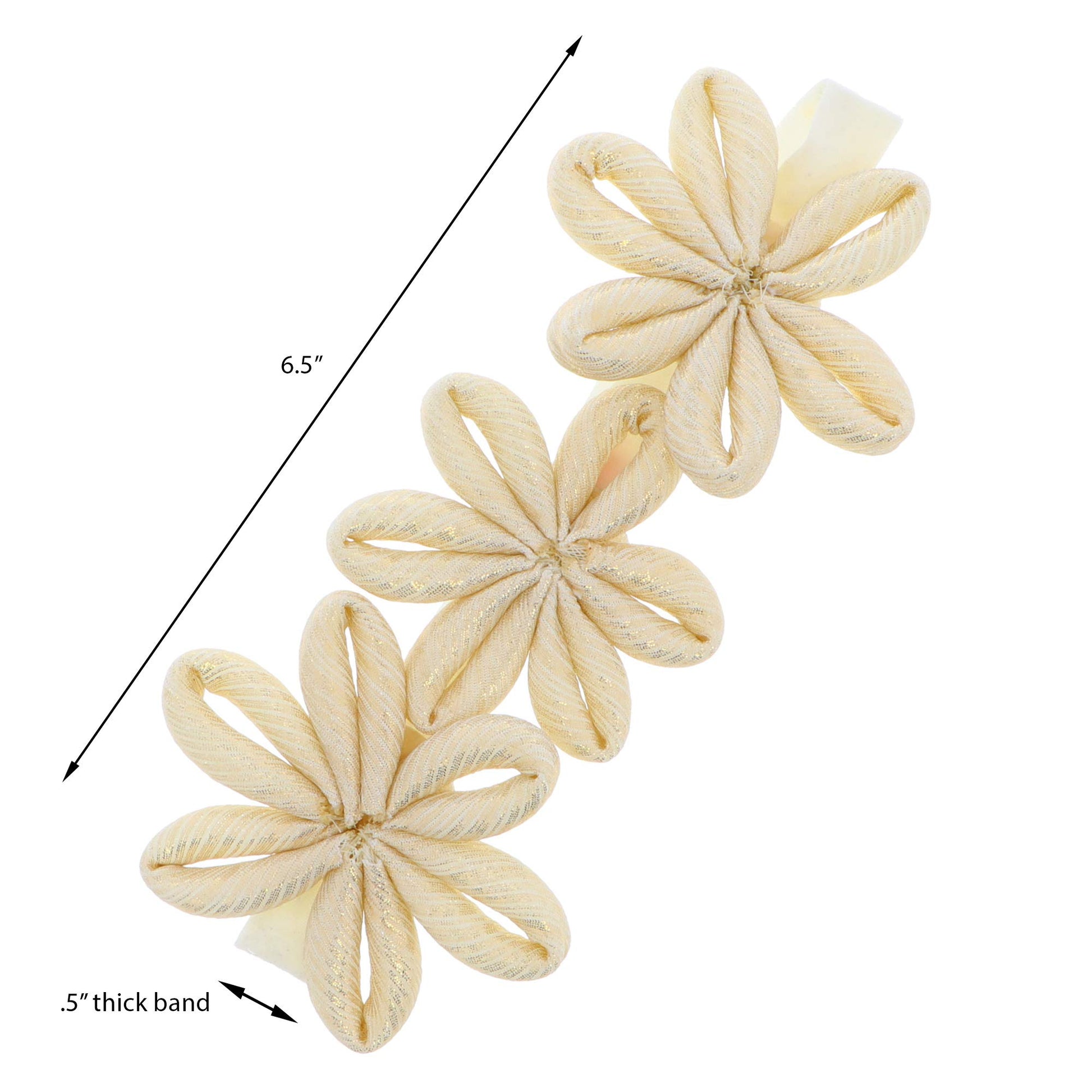 - Q: What are the dimensions of the flowers on the headband? A: The headband features three lurex tube-like flowers that measure 6.5 inches in length.