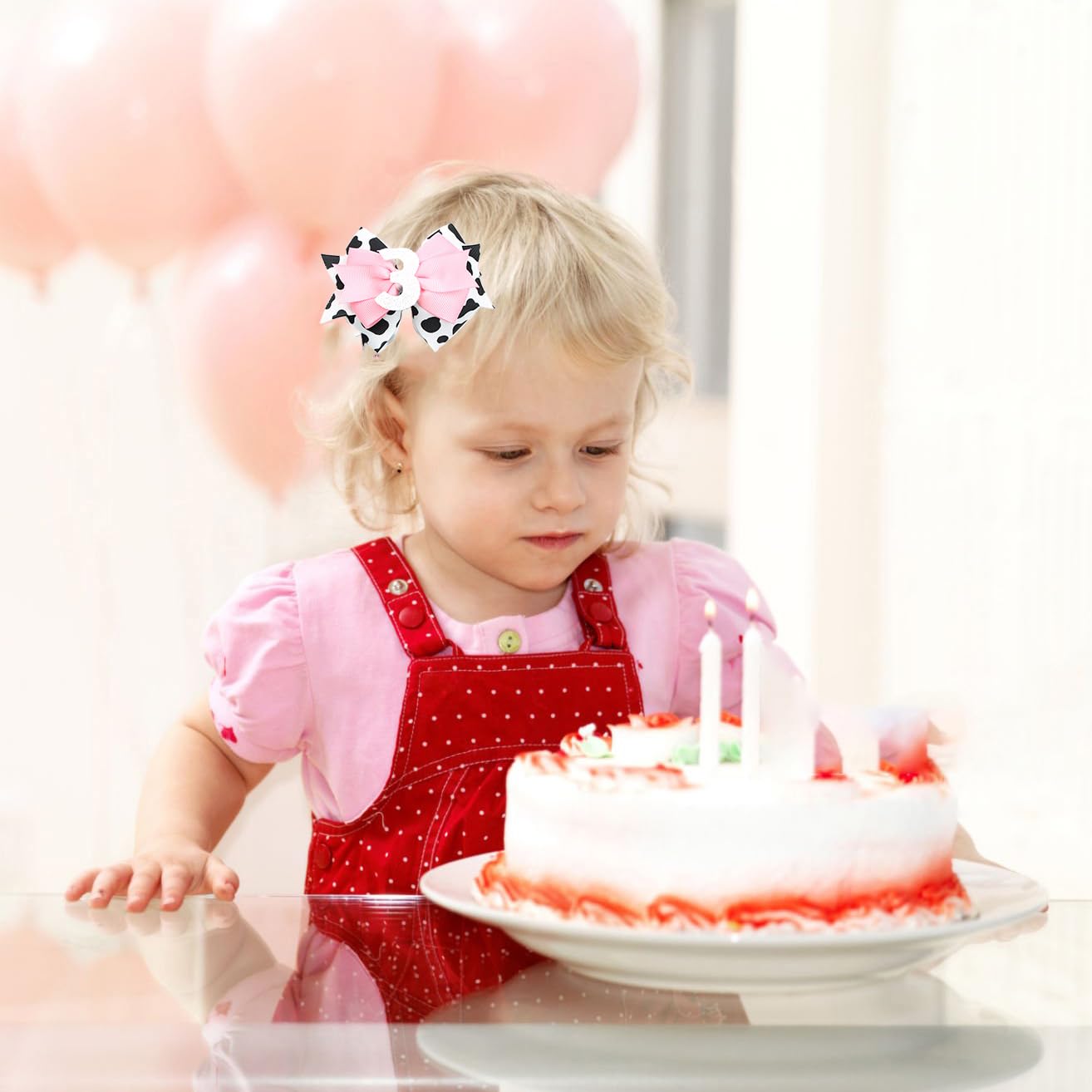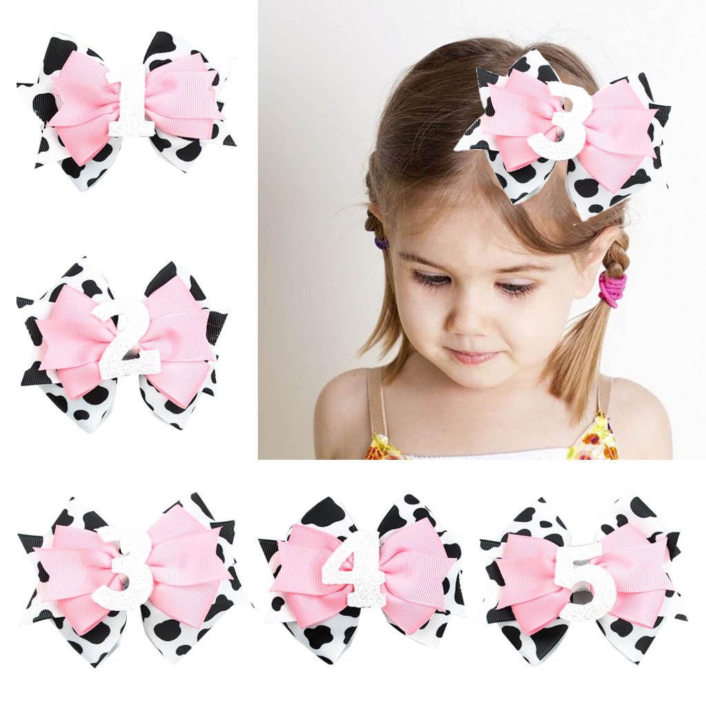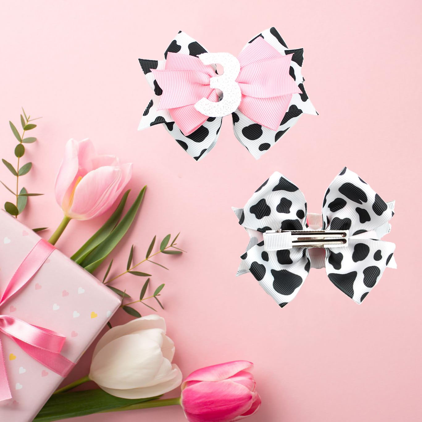- Q: How many hair clips are included in the set? A: The set includes two hair clips, featuring a cow print bow and number clips.
