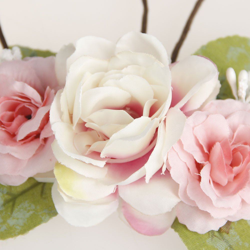 - Q: What materials are used in the DreamLily Flower Crown? A: The headband is handmade with fabric rose flowers and bunny ears.