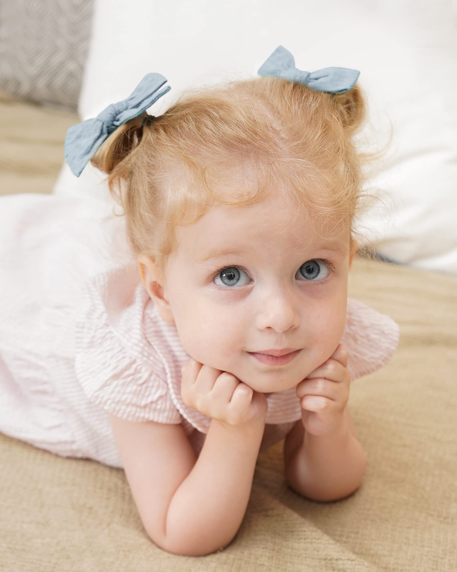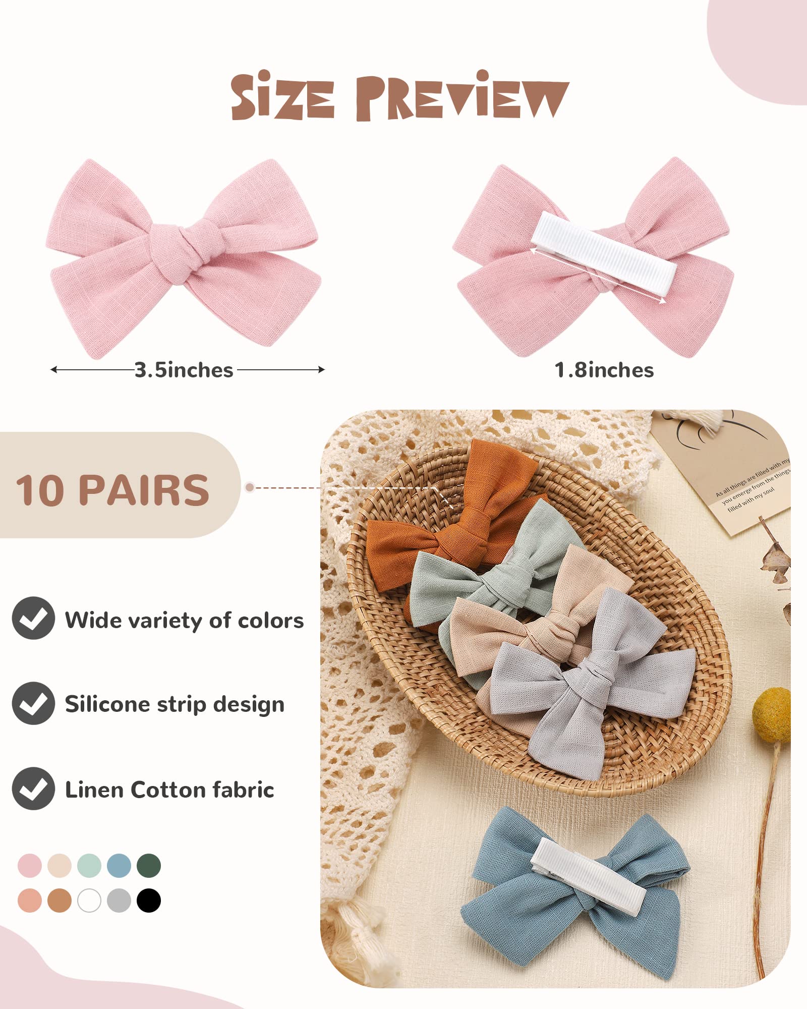 - Q: What colors are included in the hair bow set? A: The set features trendy bows in 10 different colors, including baby pink and soft khaki, to match various outfits.