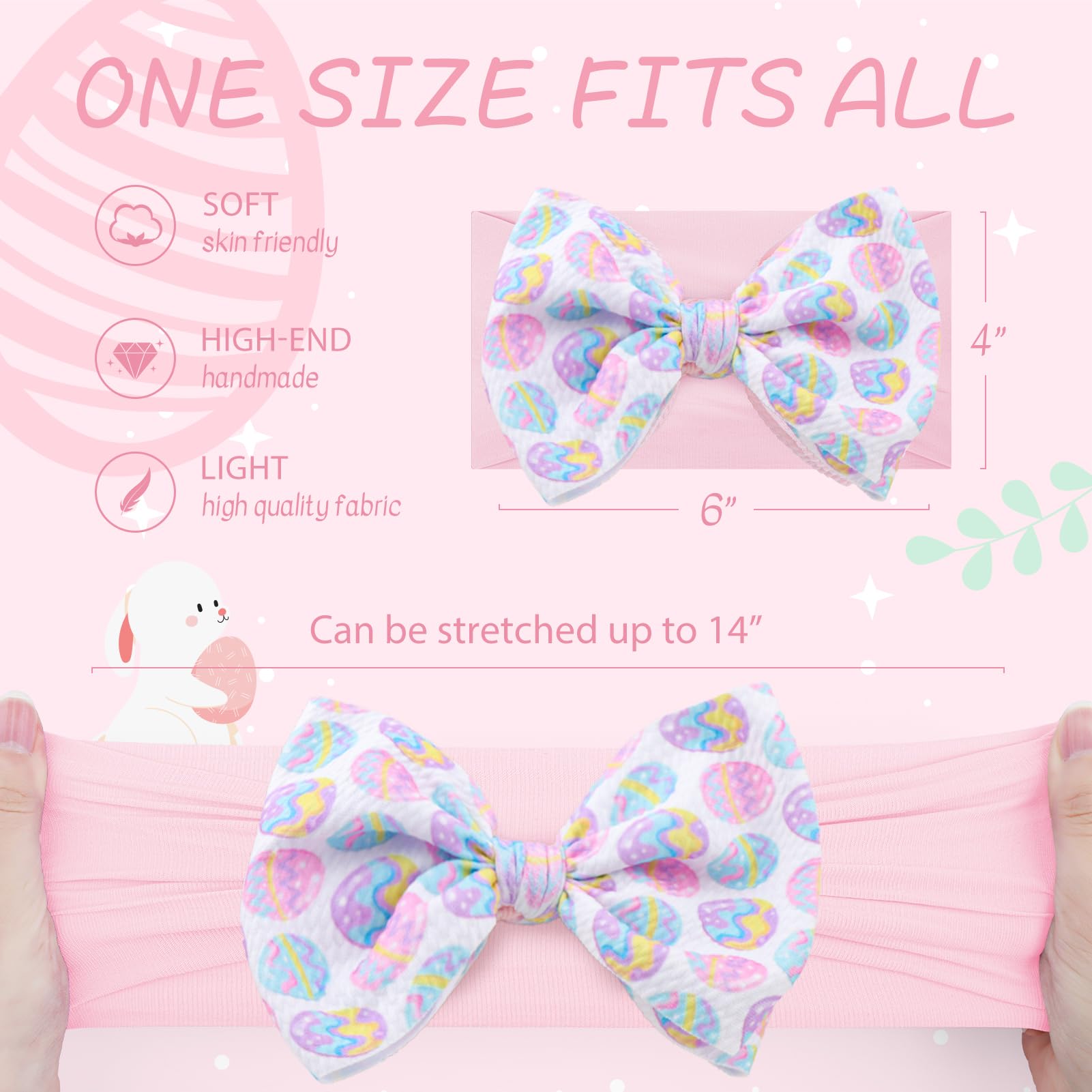 - Q: What size do the headbands fit? A: The baby bow measures 6 inches, and the elastic nylon fabric can stretch up to 14 inches, making it a one-size-fits-all option for comfort.