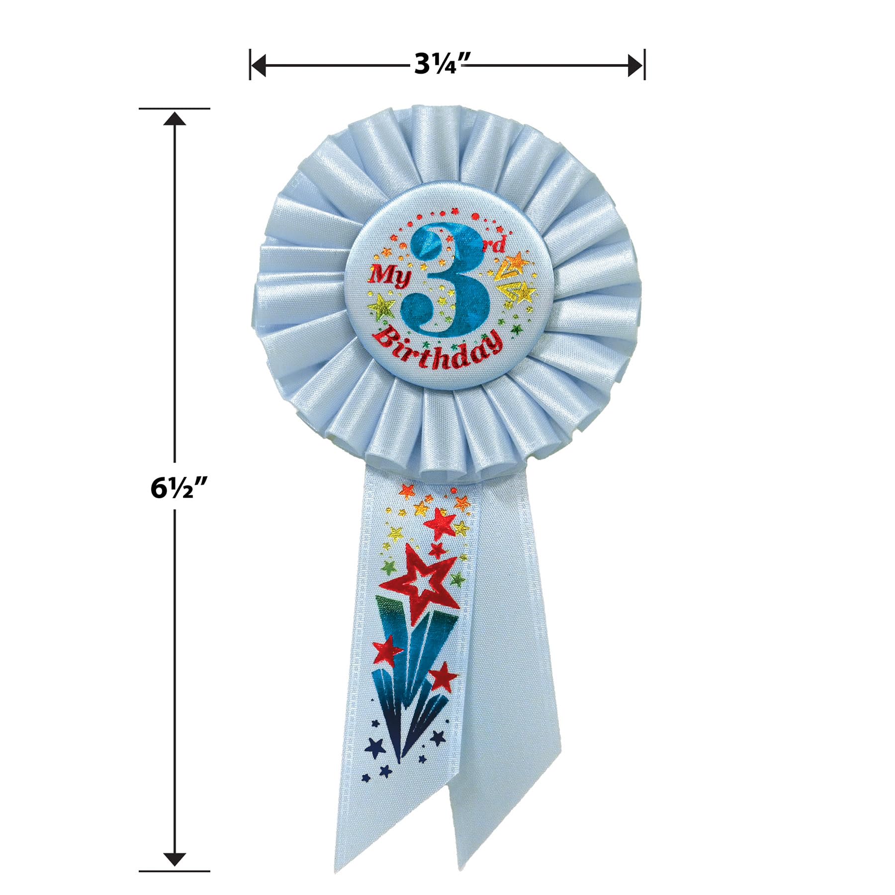 - Q: What is the size of the My 3rd Birthday Rosette in Blue? A: The My 3rd Birthday Rosette measures 3.25 inches wide by 6.5 inches long.