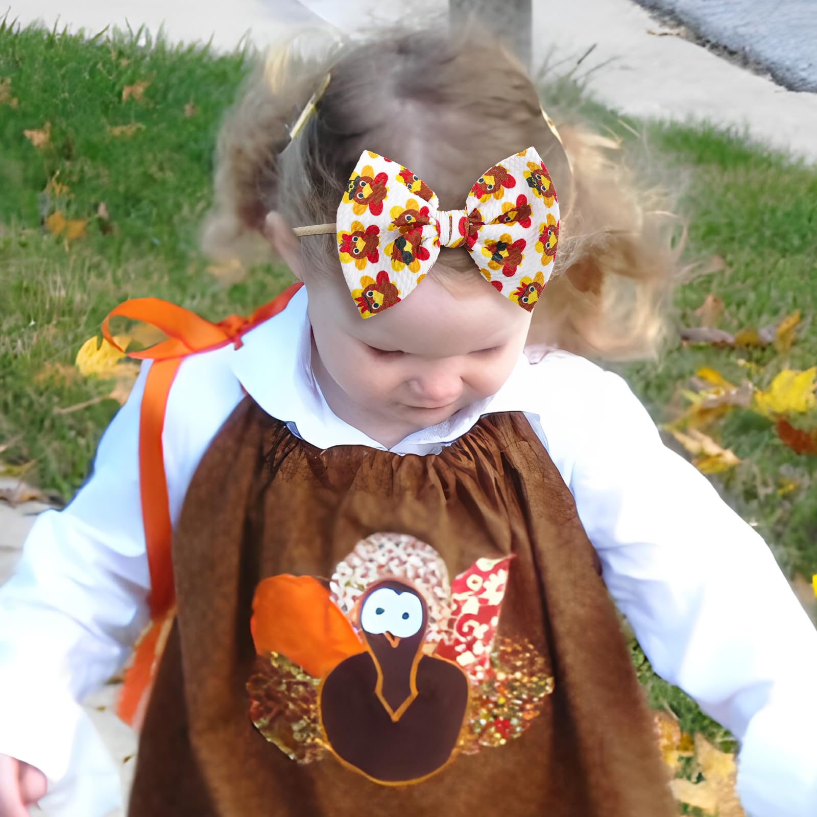 - Q: How many bows are included in the set? A: The set includes three bows: one in a pure ginger yellow color and two printed bows featuring Thanksgiving-themed elements such as turkeys, pumpkins, and sunflowers.