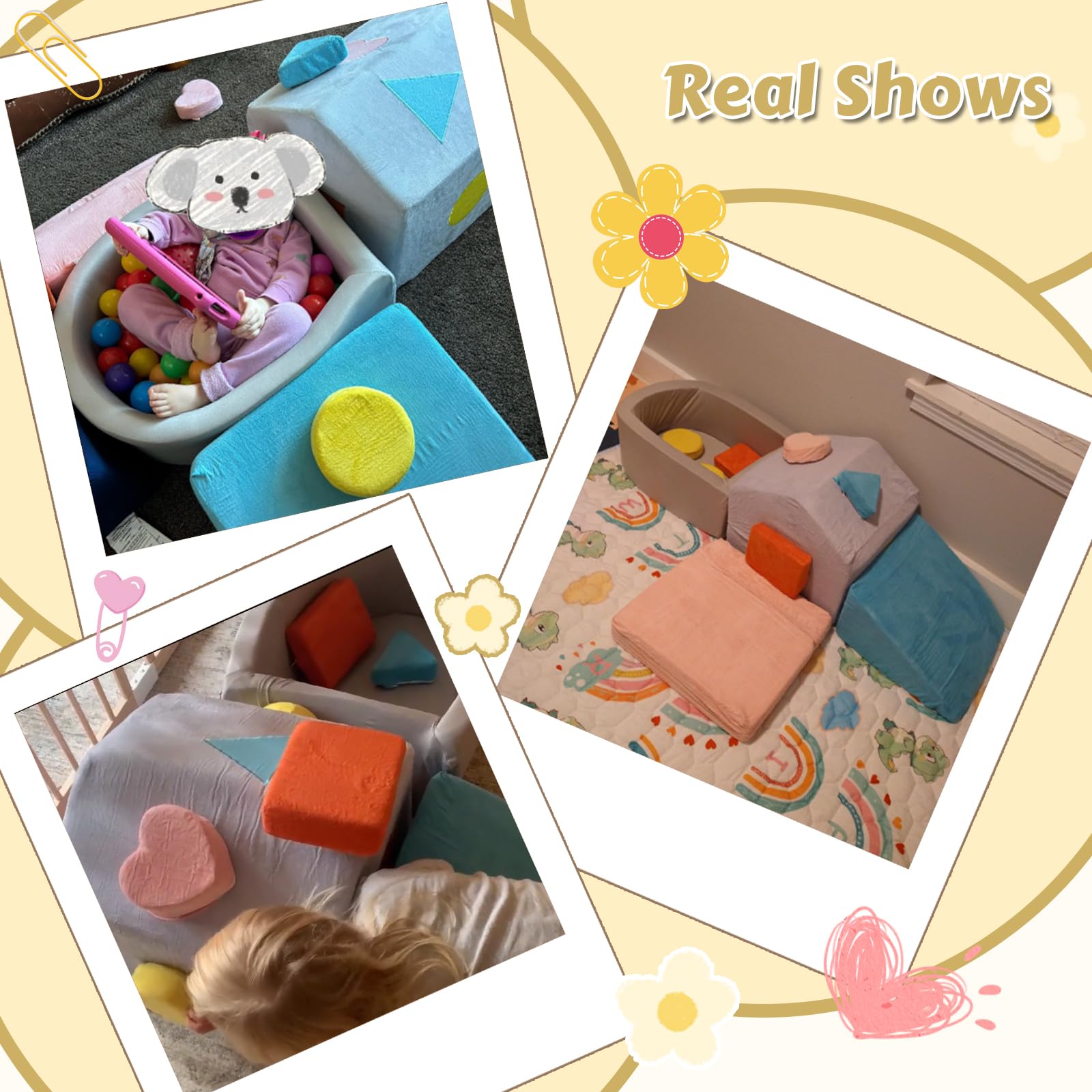 - Q: What is included in the climbing blocks set? A: The set contains six soft foam blocks in various shapes, a sloped ramp, and a house-shaped module. Balls are not included.