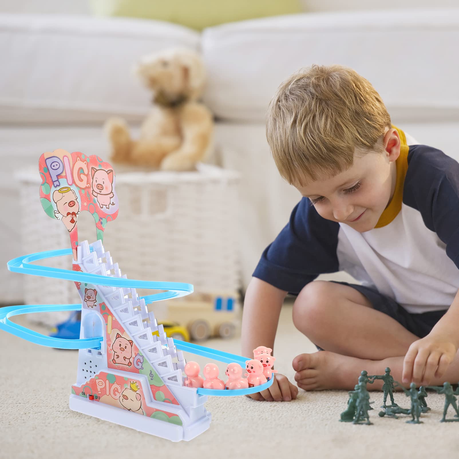 - Q: What is included in the package when purchasing this toy? A: The package includes 1 stair toy and 3 cartoon pig figures, making it a complete playset for children.