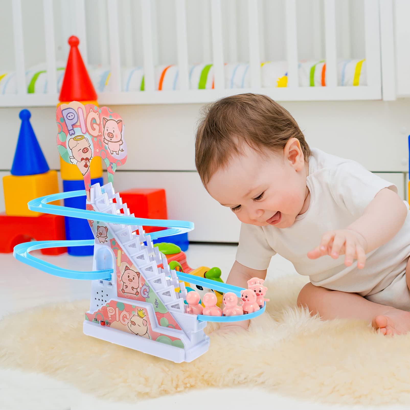 - Q: What features does the toy offer to engage children? A: The toy features a climbing roller coaster design, lights, and dynamic music, providing a multi-sensory experience to enhance playtime.