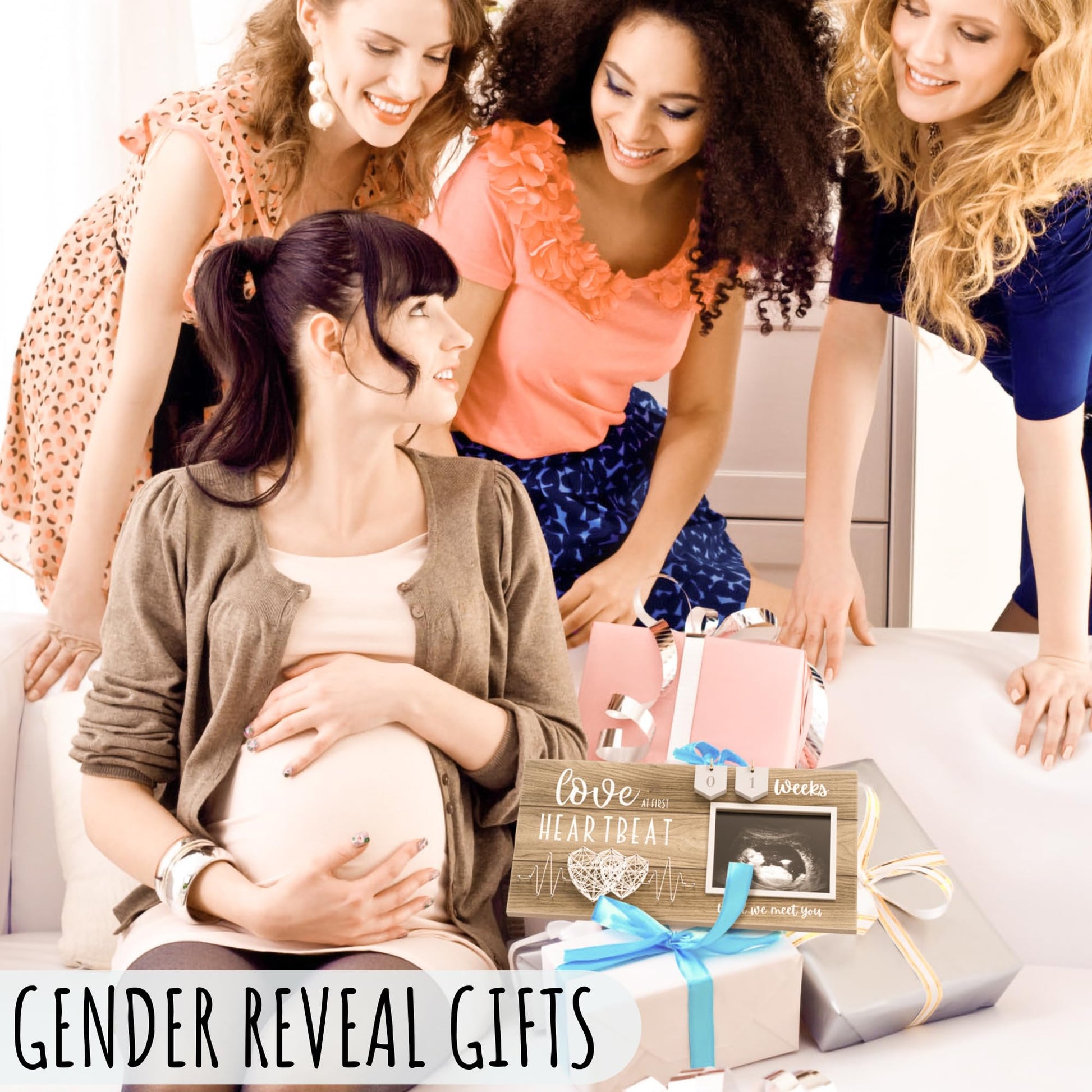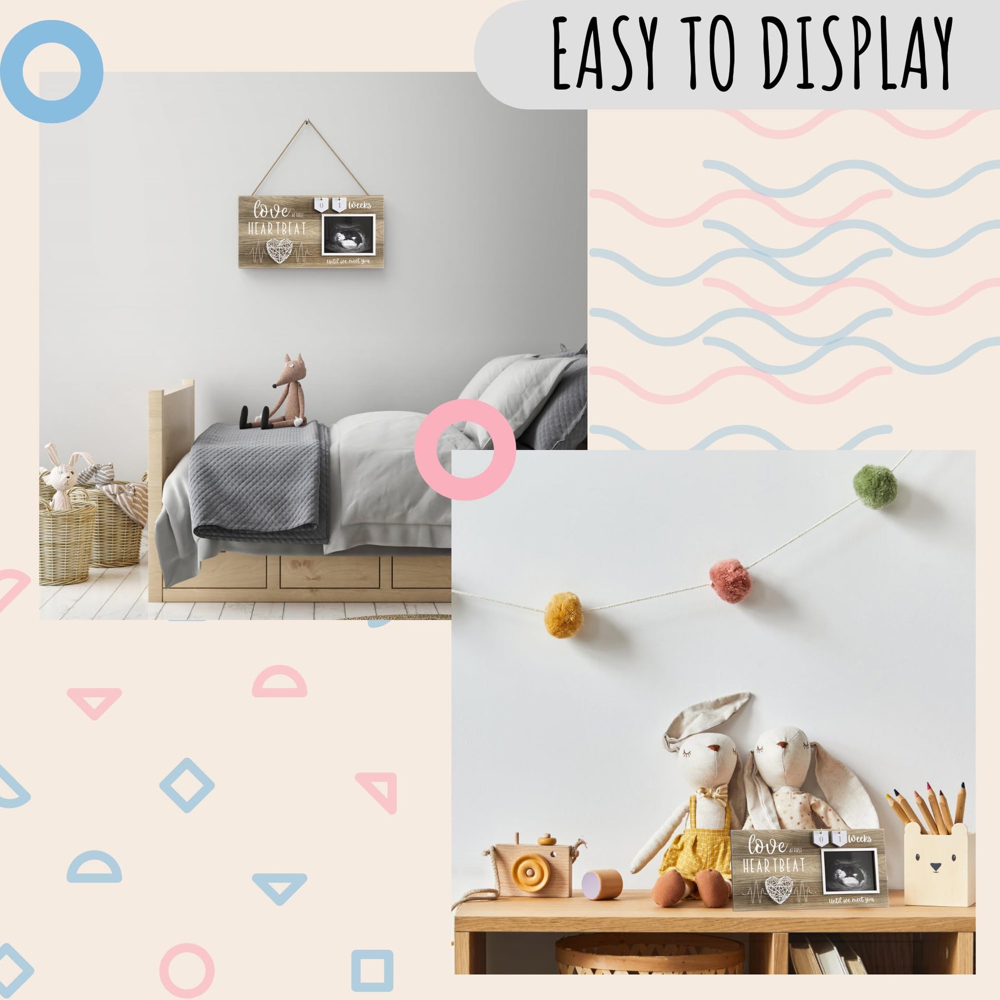 - Q: What unique features does the frame offer? A: The frame features a charming countdown display with two wooden number plaques to track the weeks until the baby's arrival, along with handmade string-art hearts.