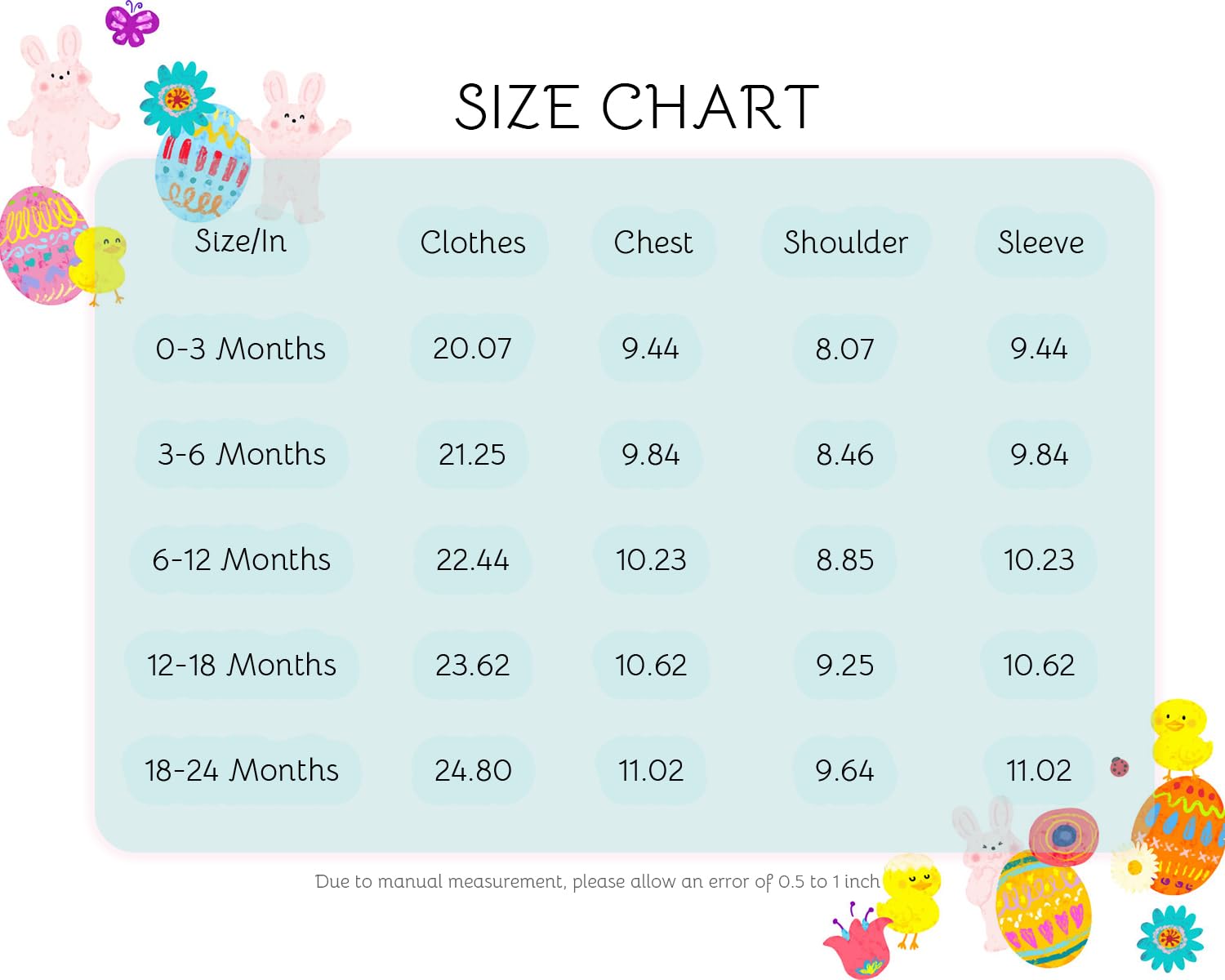 - Q: What sizes are available for the LATOBREATH Easter Costume Outfit? A: The LATOBREATH Easter Costume Outfit is suitable for newborns and infants aged 0 to 24 months. Please refer to the size chart for specific measurements to ensure a proper fit.