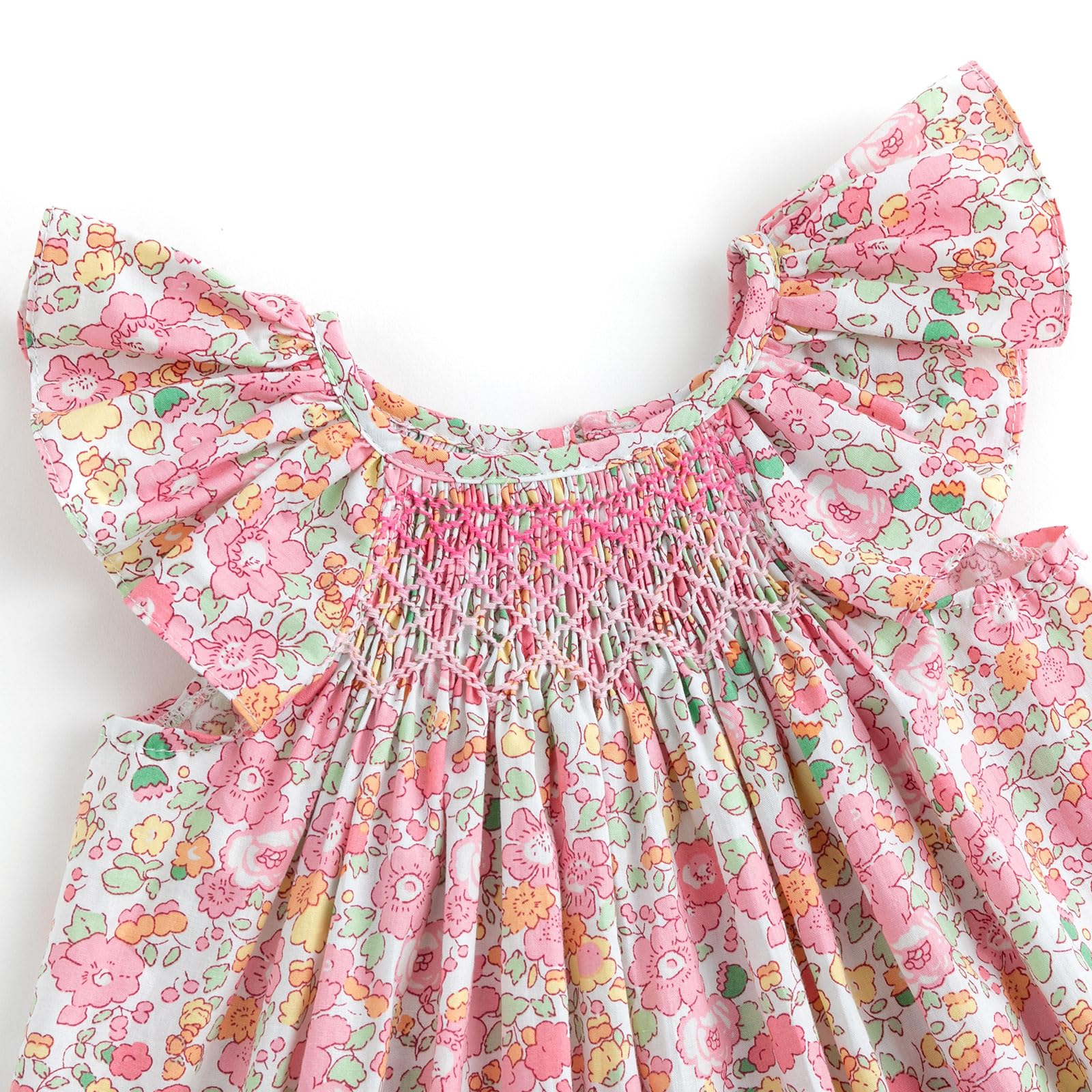 - Q: What is the design style of the dress? A: The dress features a simple yet elegant design with short ruffle sleeves, smocking detail on the chest, and vintage floral prints.