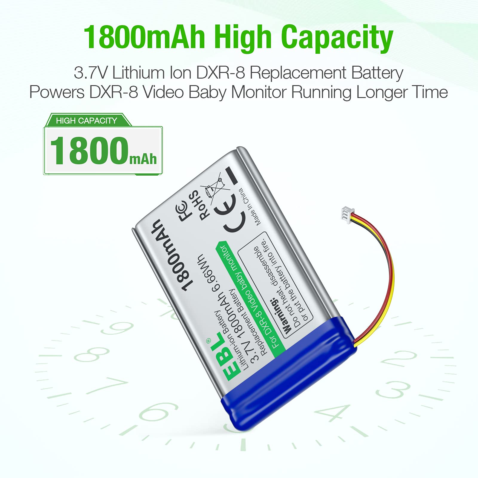 - Q: What devices are compatible with the EBL 1800mAh battery? A: The EBL 1800mAh replacement battery is designed specifically for the Infant Optics DXR-8 video baby monitor and other similar devices.