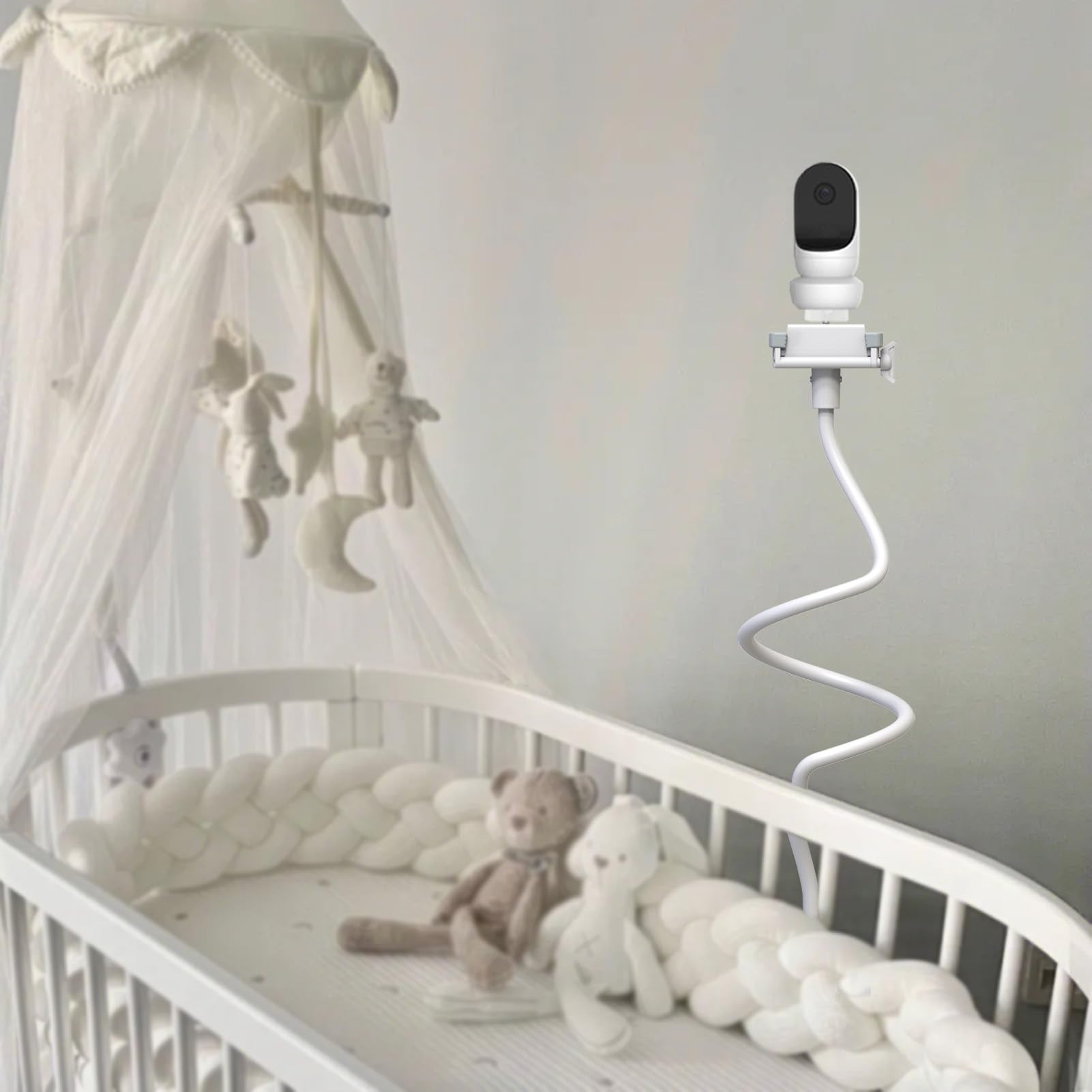 - Q: How long is the flexible arm of the baby monitor holder? A: The flexible arm of the baby monitor holder measures 33.5 inches, allowing you to get the best view of your baby.