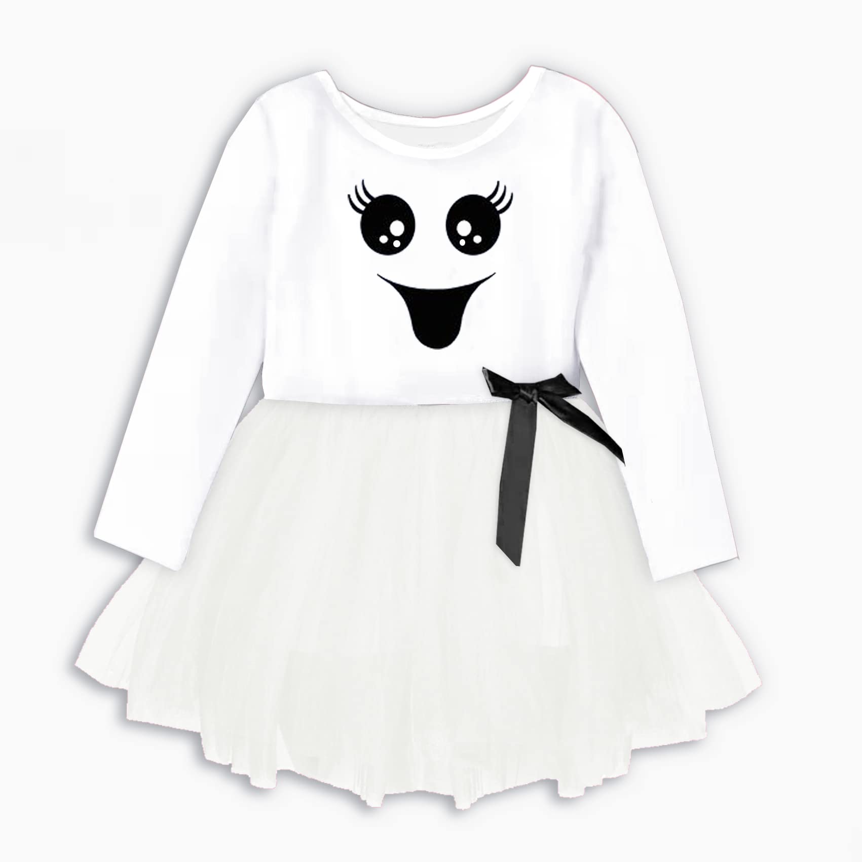 - Q: Does the dress have any special design features? A: Yes, the dress features a cute Halloween ghost print, long sleeves, and a tulle tutu skirt with a ruffle layered soft lining and a ribbon bow.