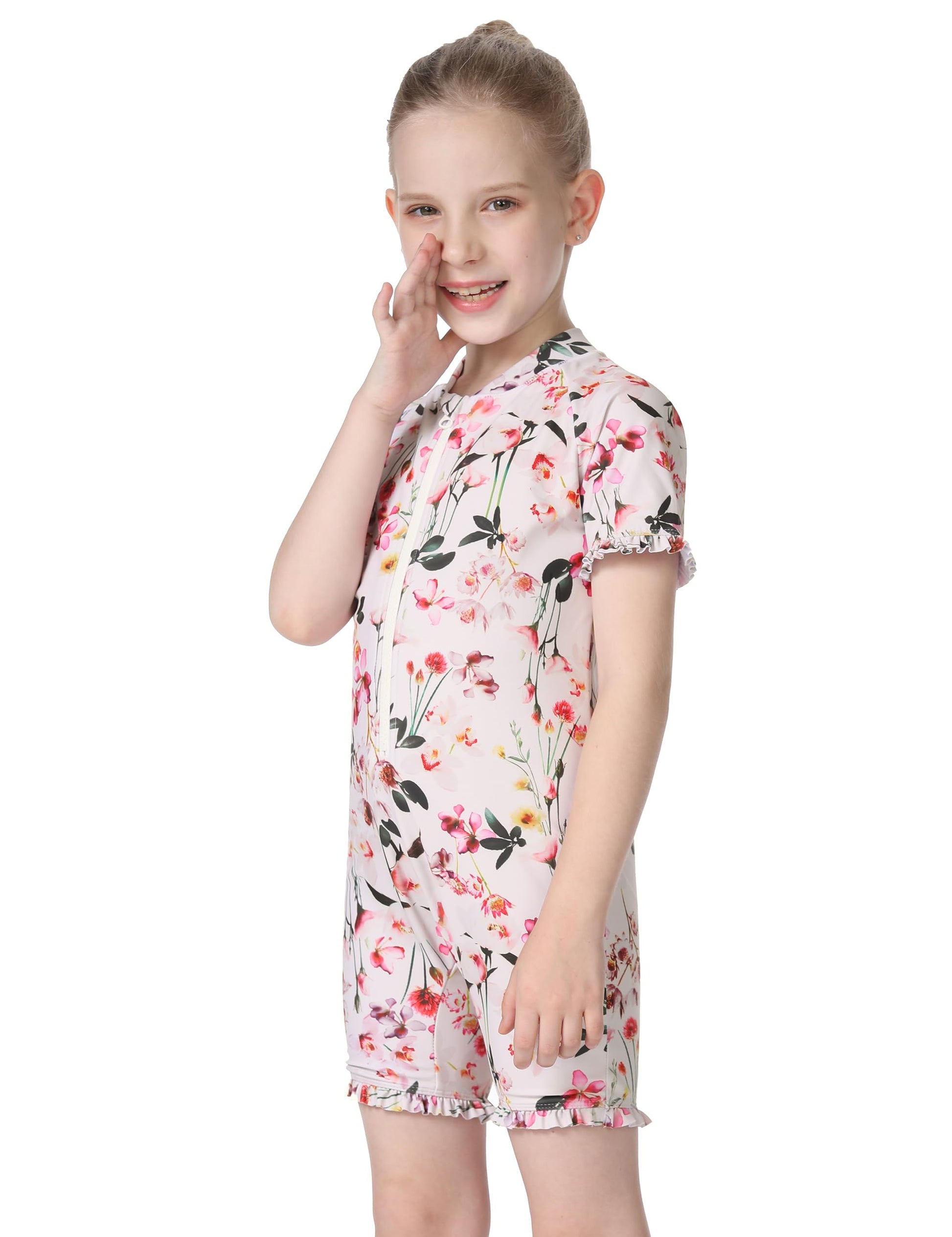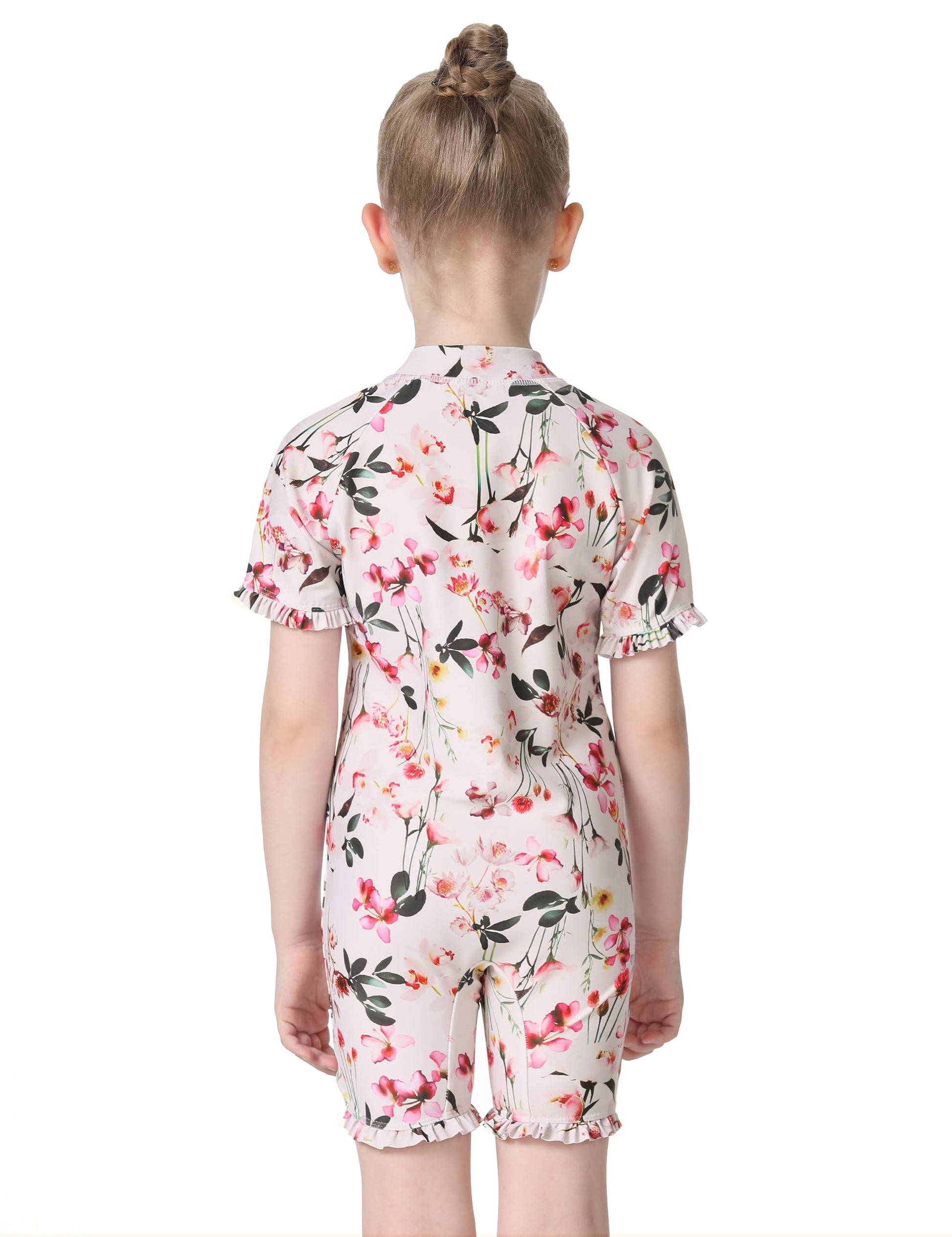- Q: Does the swimsuit have any special design features? A: The swimsuit includes a fun floral print, ruffle trim at the arms and legs, and a stand collar for added style and coverage.