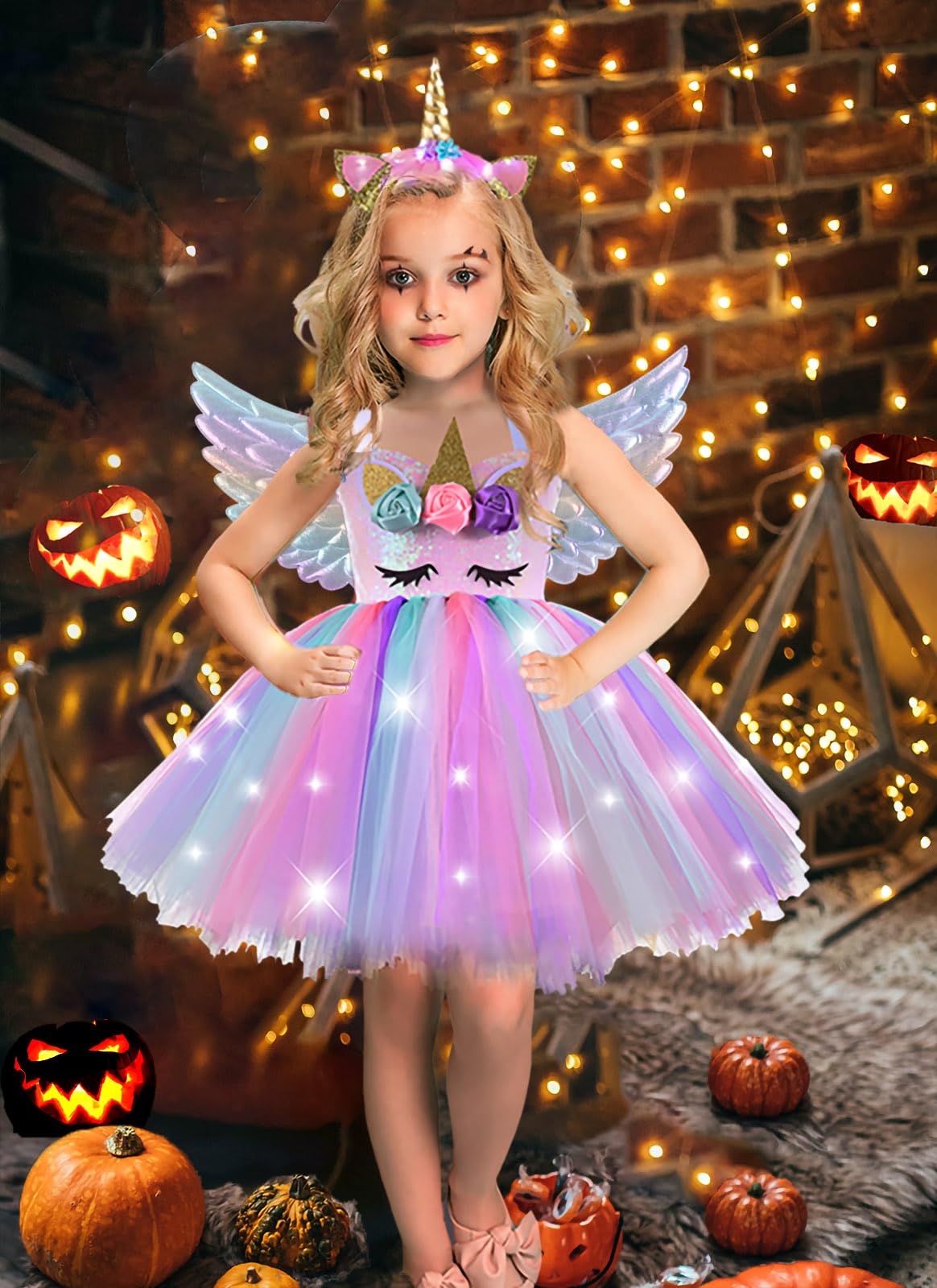 - Q: Does the costume include any accessories? A: Yes, the costume includes a lighted unicorn headband, a unicorn tutu dress, and non-lighted unicorn wings.