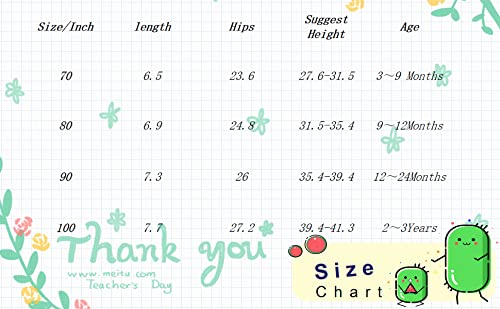 - Q: How long are the bloomer shorts in each size? A: The lengths vary by size: SIZE 70 is approximately 6.5 inches, SIZE 80 is about 6.9 inches, SIZE 90 is around 7.3 inches, and SIZE 100 measures about 7.7 inches.