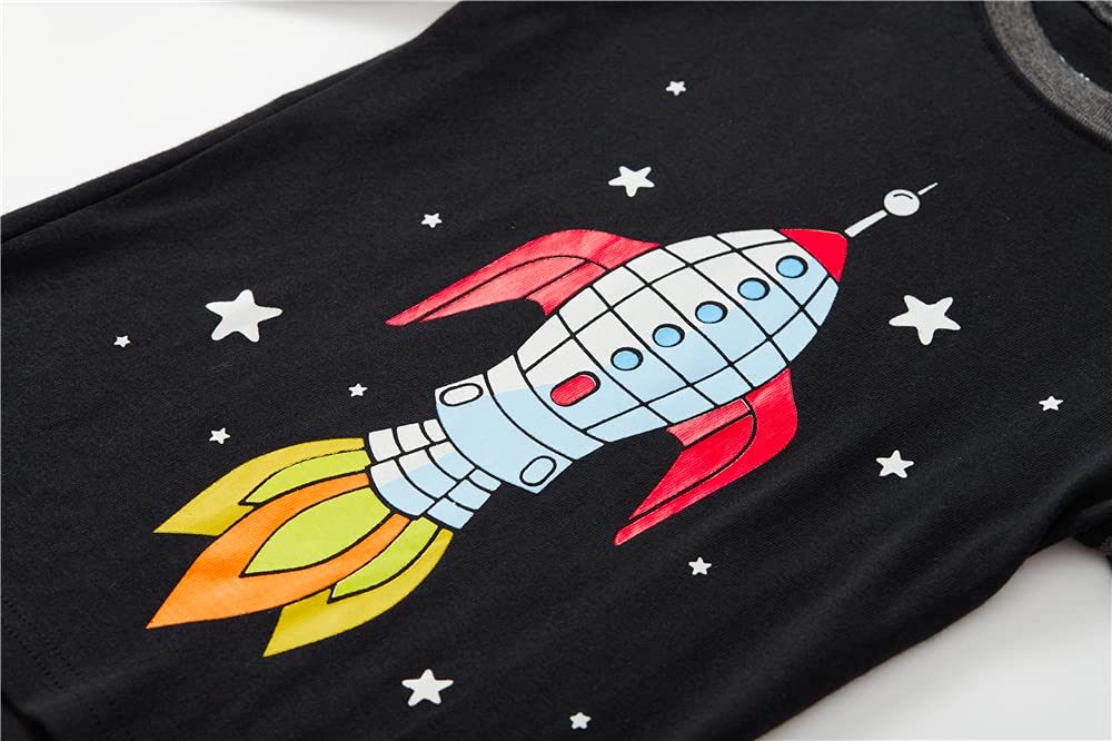 - Q: What is the design style of these pajamas? A: The pajamas feature an imaginative space rocket design, with a crew neck shirt and matching pants that have an elasticized waistband.