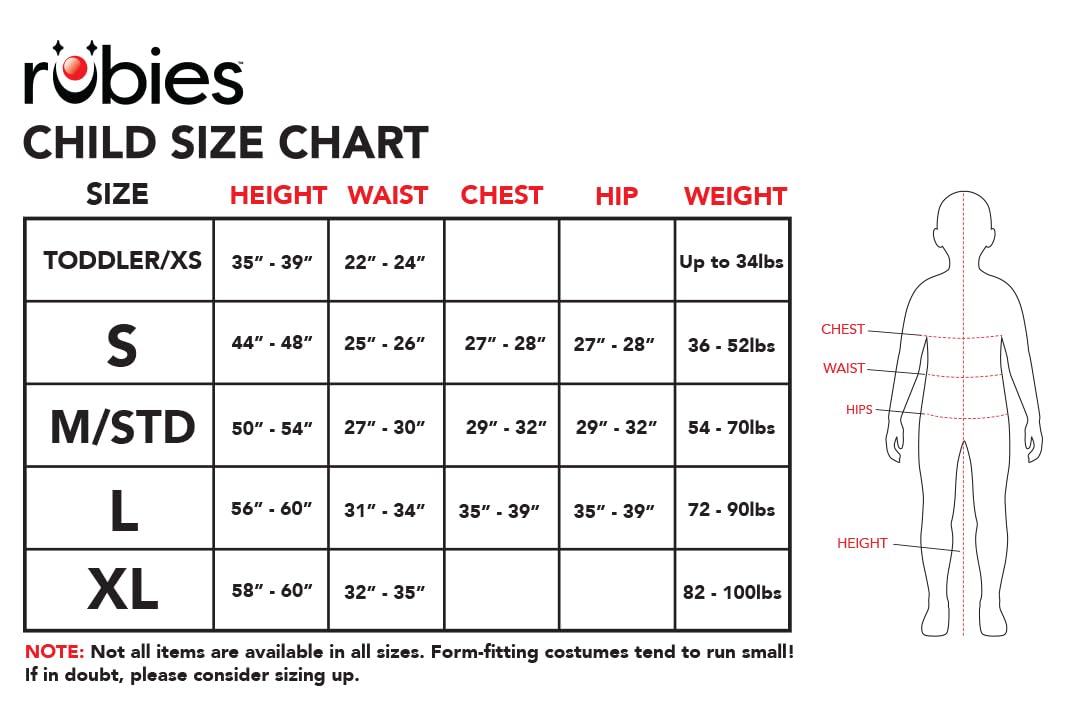 - Q: Does the costume run true to size? A: The top of the costume tends to run small, while the pants are true to length. If your child is at the upper end of the size range, consider moving up a size.