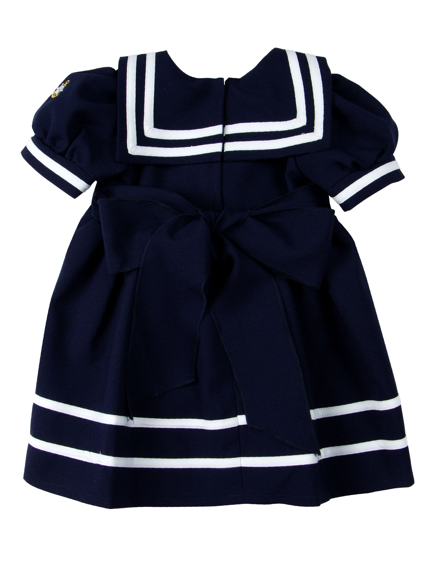 - Q: What are the key features of the dress? A: Key features include six gold nautical buttons, an attached bow in front, and a sash at the back for the best fit.