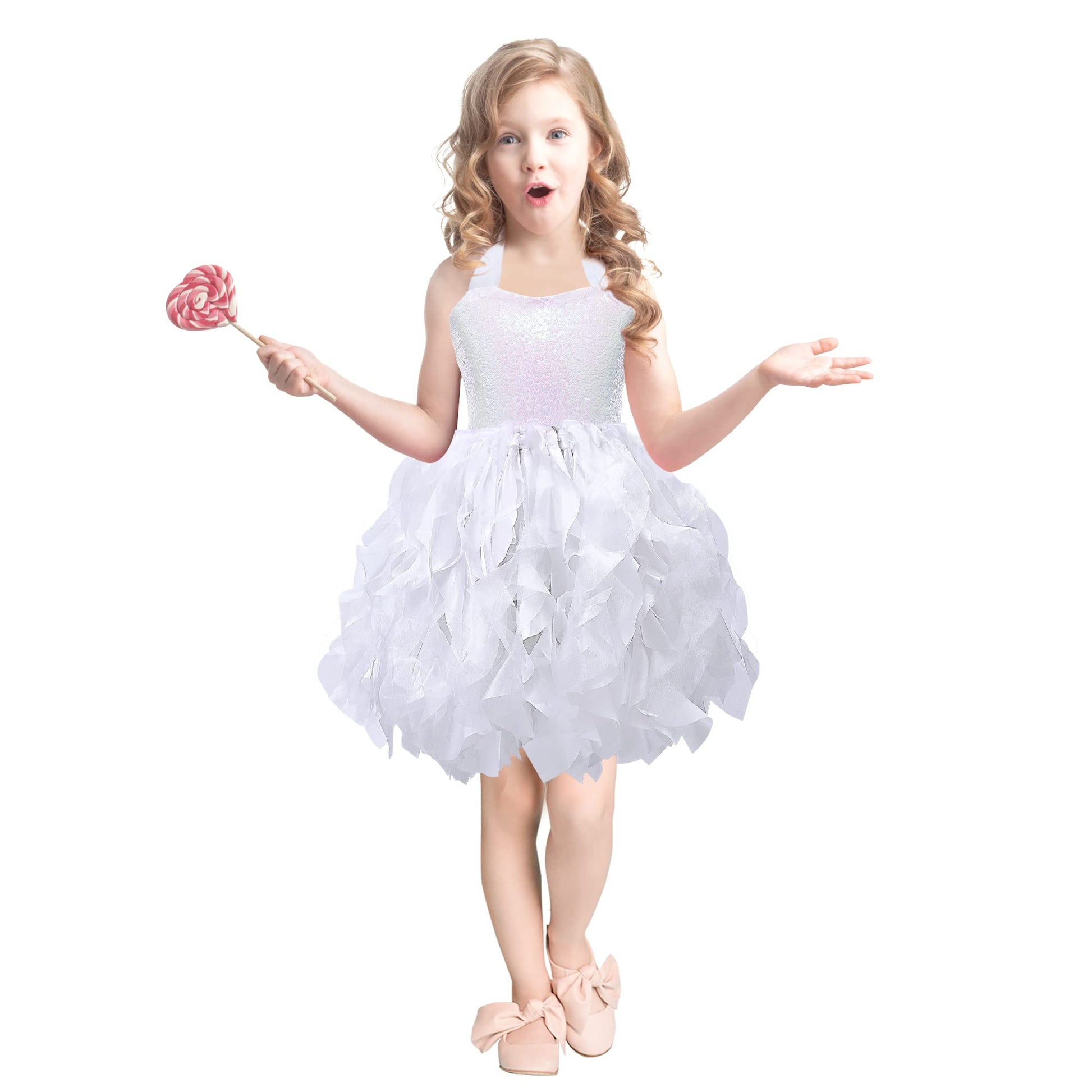 - Q: What is the design style of the dress? A: The dress features a sleeveless design with a sparkly stretchy sequined top and layered handmade curly tulle, creating a beautiful princess look.