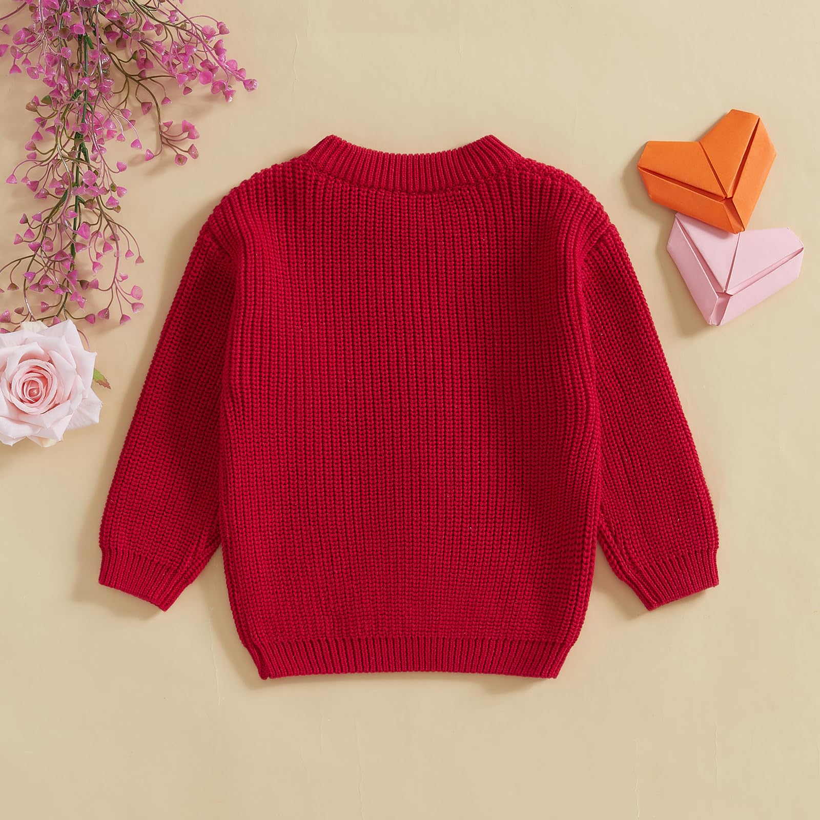 - Q: What sizes are available for the Toddler Valentine's Day Knit Sweater? A: The sweater is available in sizes for 6-12 months, 12-18 months, 18-24 months, 2-3 years, and 3-4 years.
