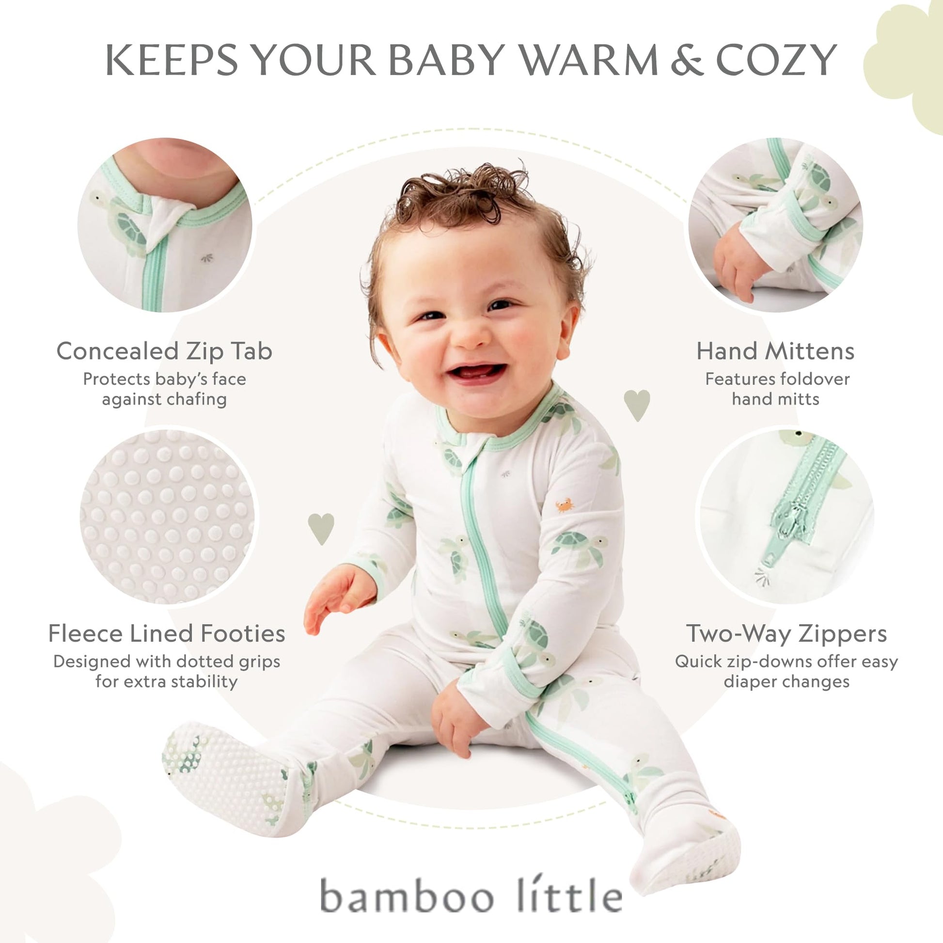 - Q: Do the footies have a zipper? A: Yes, the footies feature a 2-way zipper from the neckline to the foot for easy dressing and diaper changes.