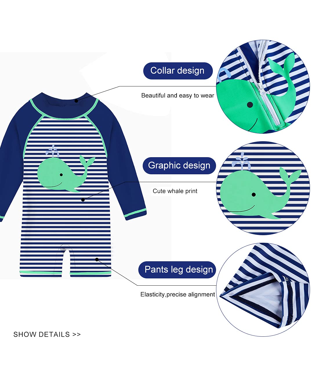 - Q: What are the design features of the swimsuit? A: The swimsuit features long sleeves, a back zipper for easy dressing, and cute graphic prints like sharks and dinosaurs.