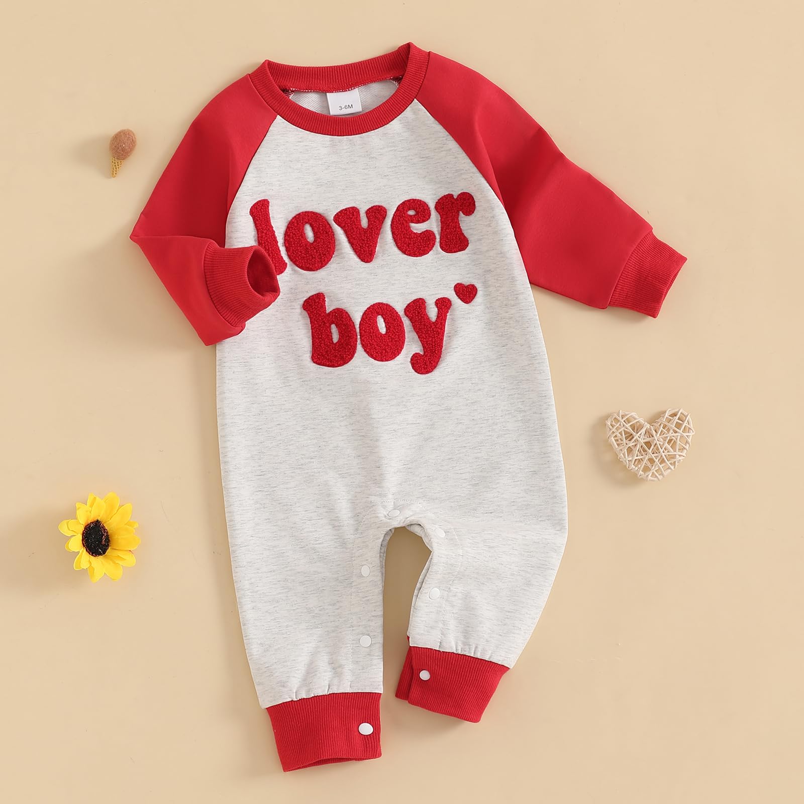 - Q: Does this romper have any special features? A: Yes, the romper features an embroidery design with the phrase 'lover boy' and a snap button for easy diaper changes.