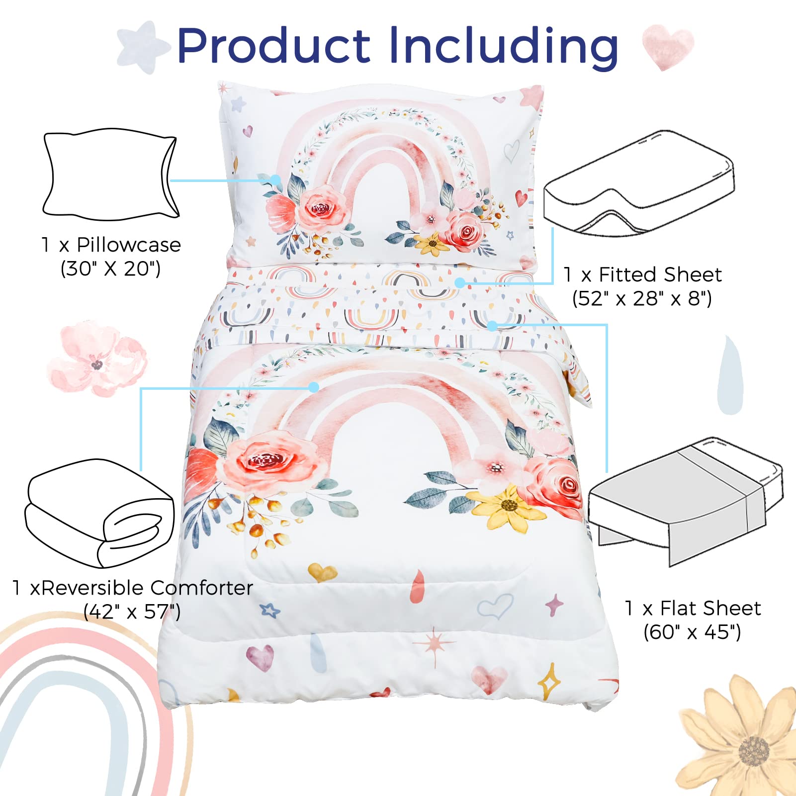 - Q: What is the design of the bedding set? A: The bedding set features a vibrant design with rainbow and flower decor, hearts pattern, and colorful raindrops, making it visually appealing for children's rooms.