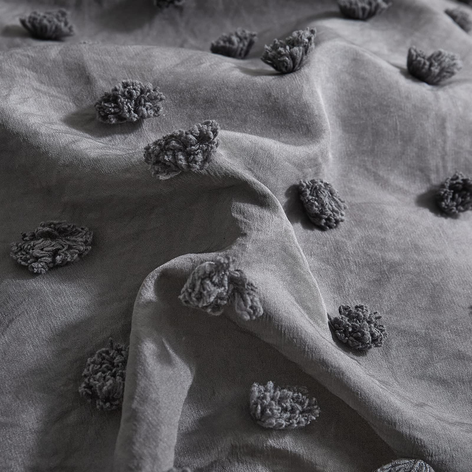 - Q: What are the care instructions for the pom pom tufts? A: The pom pom tufts are part of the bedding set, and they should be cared for by following the overall care instructions, avoiding bleach and dry cleaning.