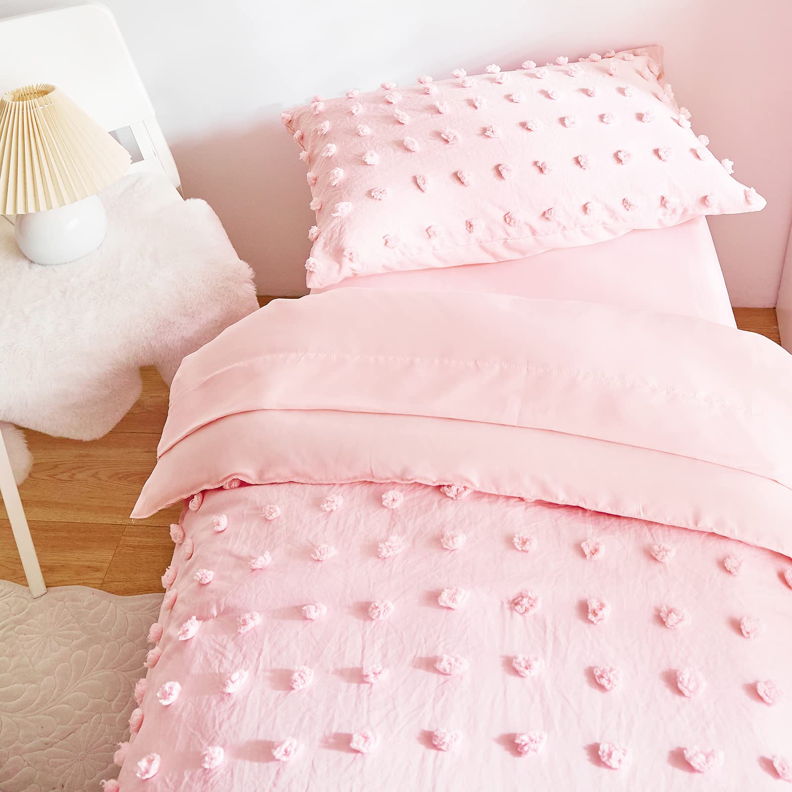 - Q: What design features does this bedding set have? A: The bedding set features a sophisticated jacquard tufted embroidery design with decorative pink pom pom tufts, adding a unique and beautiful touch to a toddler's bedroom.