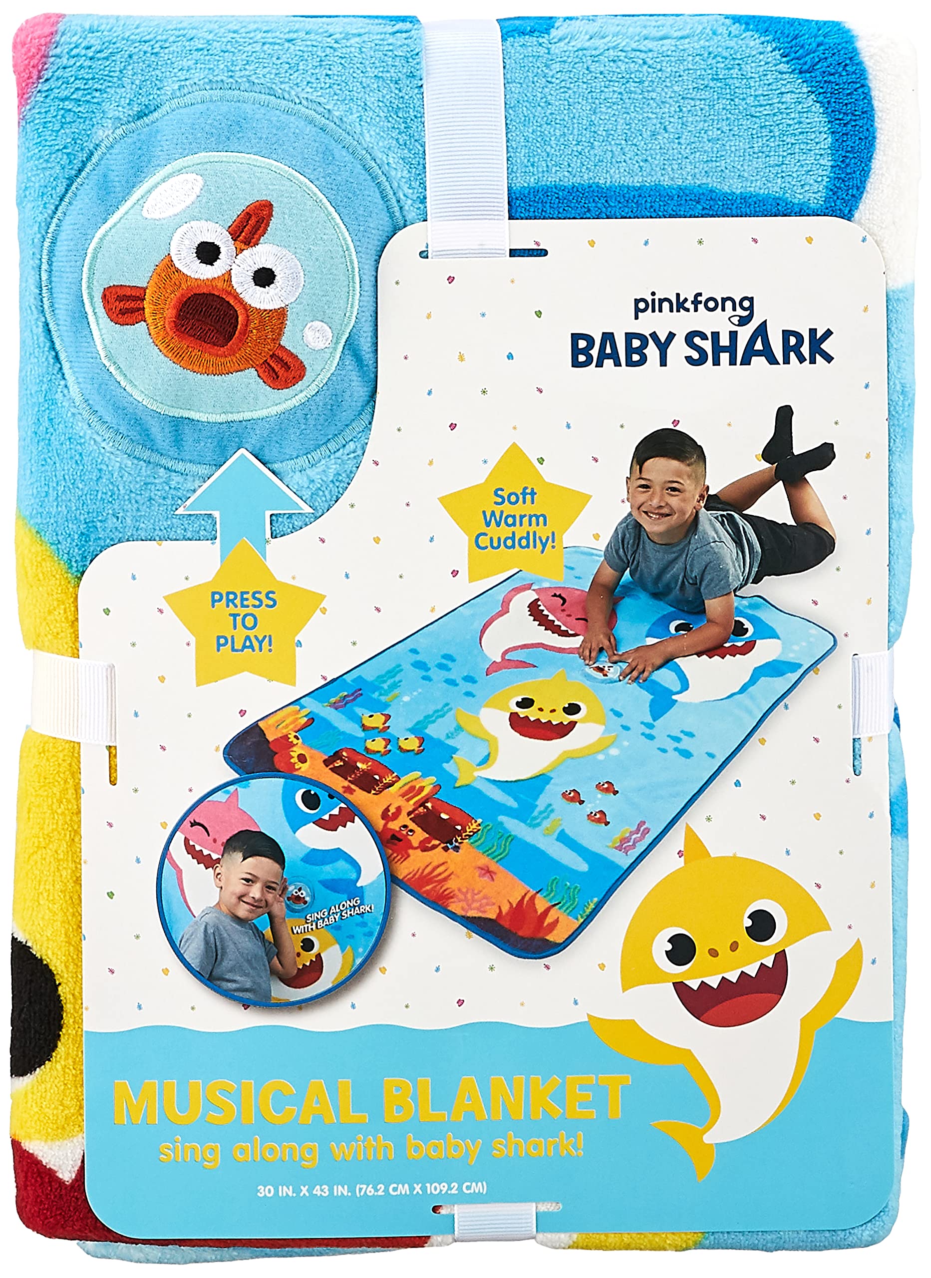 - Q: How does the musical feature work? A: Simply press the designated spot on the blanket to hear the Baby Shark theme song play.