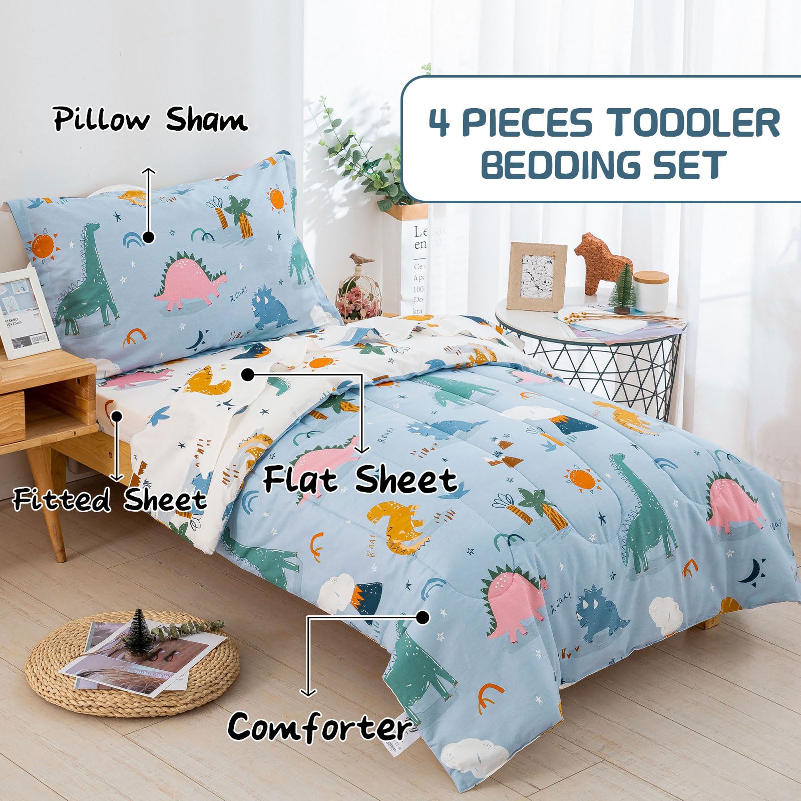 4 Pieces Cotton Toddler Bedding Set, Dinosaur Toddler Bed Comforter Set for Boys Girls, Includes Blue White Reversible Comforter, Flat Sheet, Fitted Sheet and Pillowcase