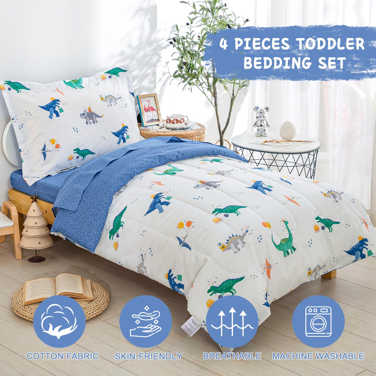 - Q: What does the 4-piece toddler bedding set include? A: The 4-piece toddler bedding set includes one comforter measuring 42 inches by 57 inches, one flat sheet measuring 45 inches by 60 inches, one fitted sheet measuring 28 inches by 52 inches with an 8-inch pocket, and one pillowcase measuring 20 inches by 30 inches.