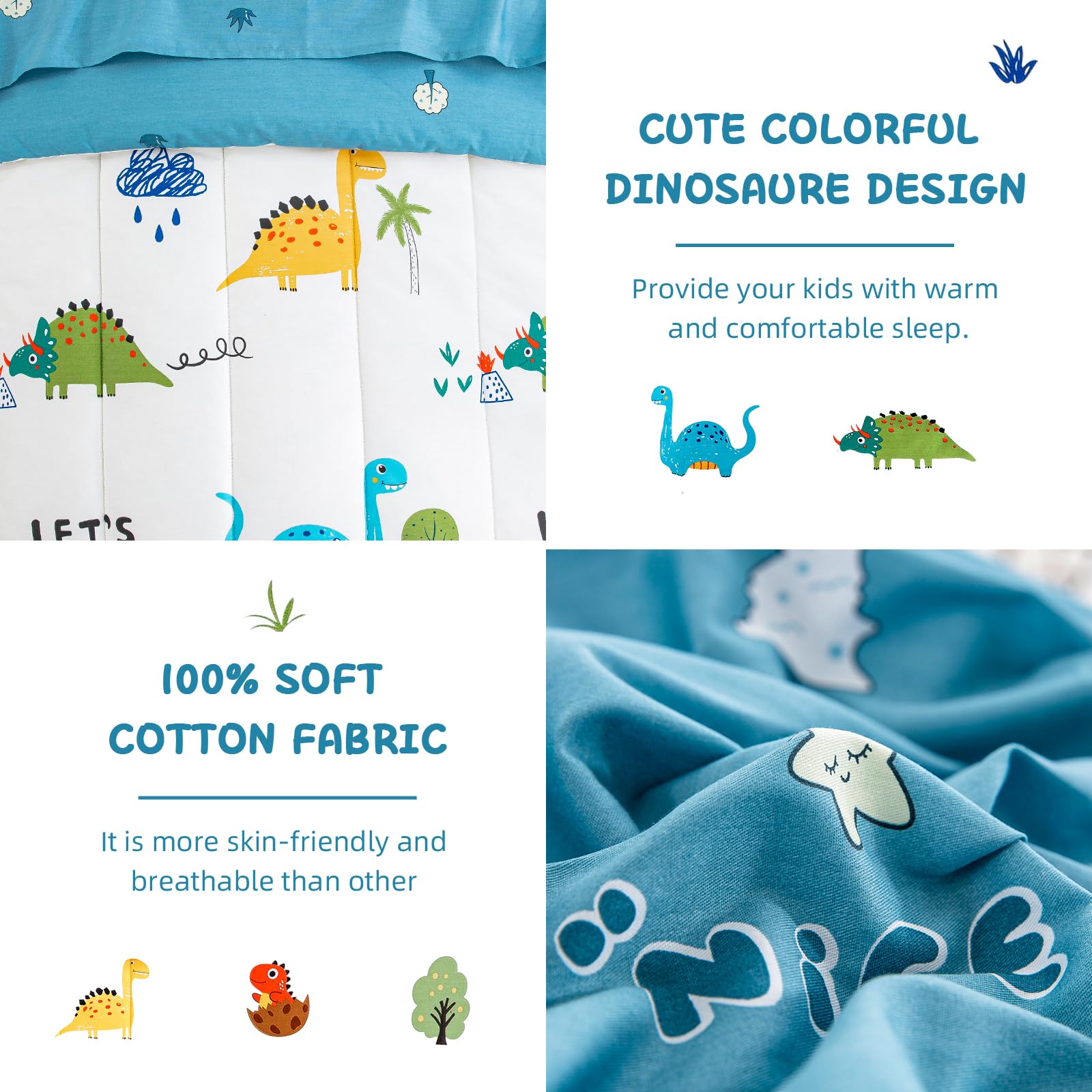 - Q: What is the design of the toddler bedding set? A: The bedding set features a unique dinosaur pattern design printed with colorful dinosaurs, bringing joy and vibrancy to any child's room.
