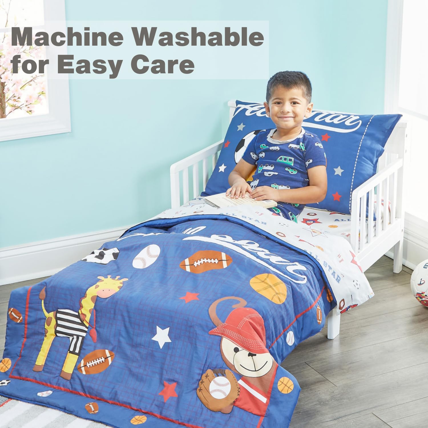 - Q: What items are included in the 4 Piece Toddler Bedding Set? A: The set includes a comforter, a flat sheet, a fitted sheet, and a reversible pillowcase.