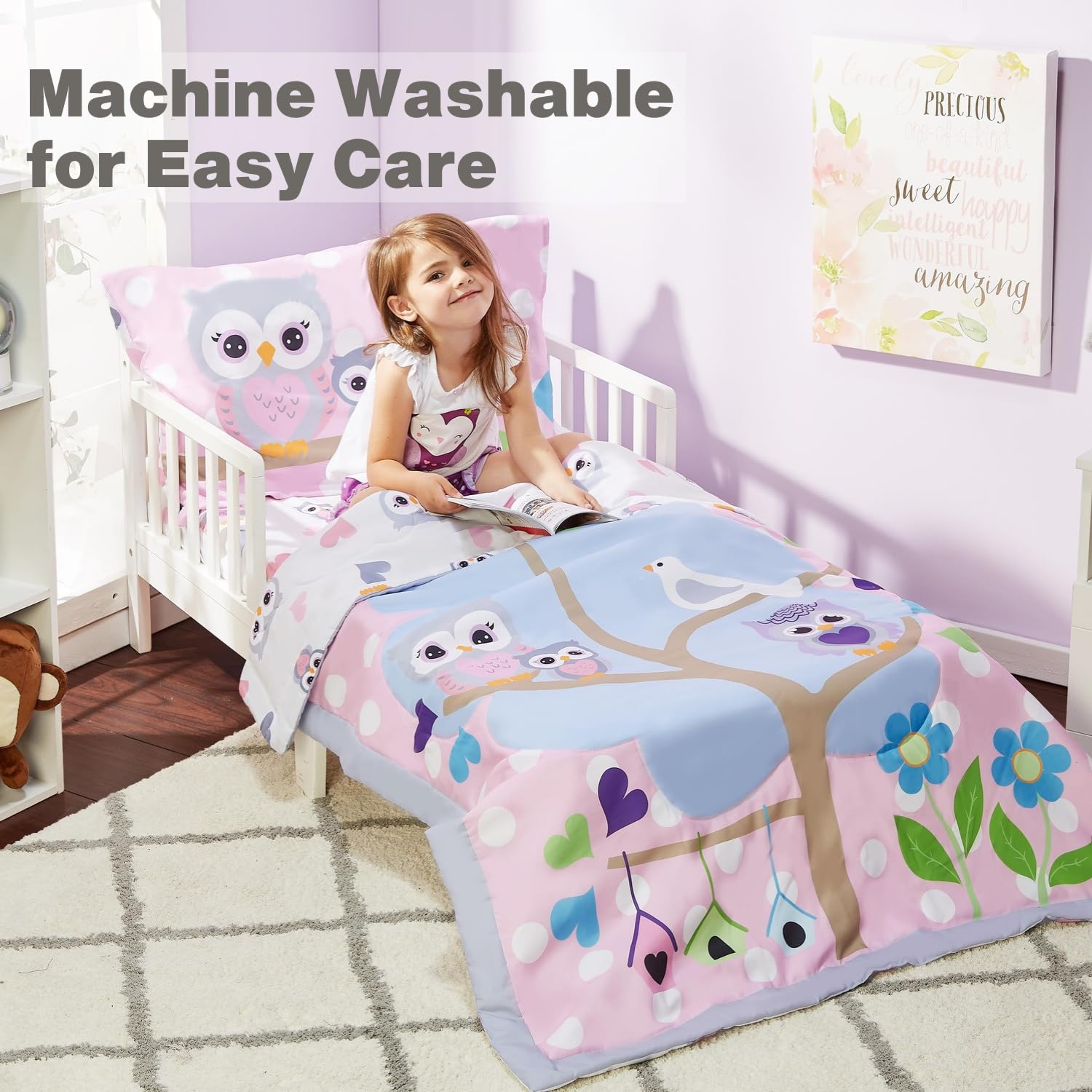 - Q: What themes or designs are available in this bedding set? A: The Everyday Kids Toddler Bedding Set features a fun theme with colorful mommy and baby owls, along with pink and purple hearts on a white background.