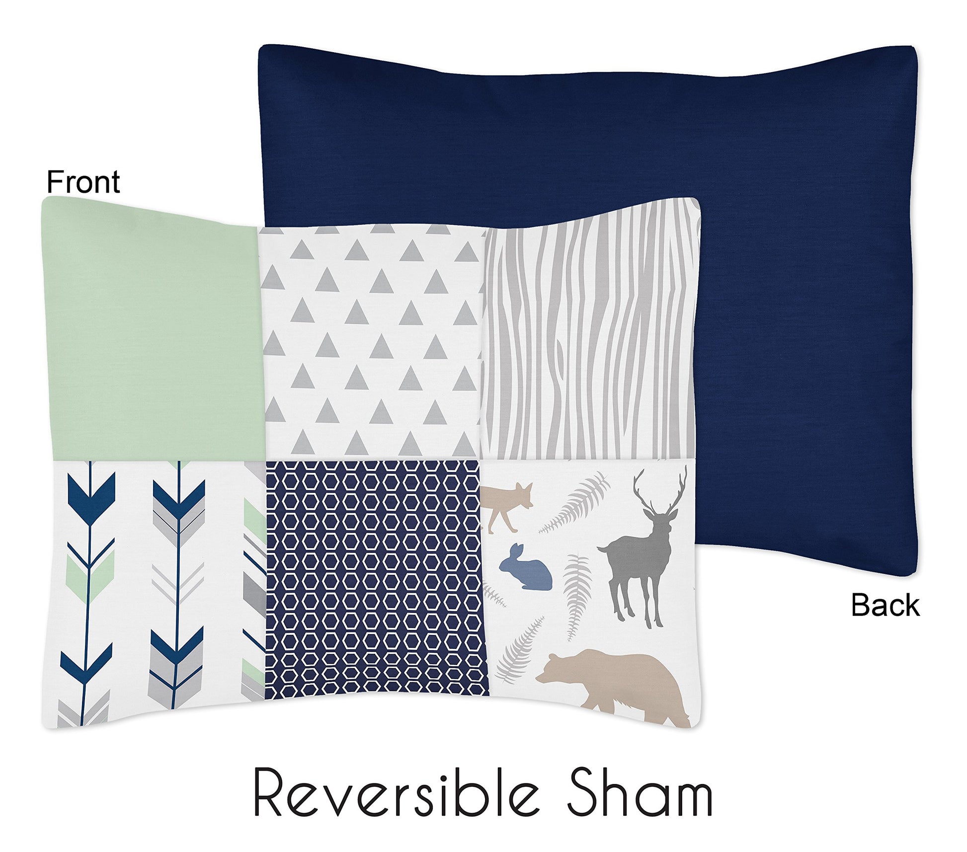• Q: What is included in the Navy Blue, Mint and Grey Woodsy Deer Boys Toddler Bedding 5 Piece Comforter Sheet Set? A: The set includes a toddler comforter, a sham, a pillowcase, a flat sheet, and a fitted sheet.