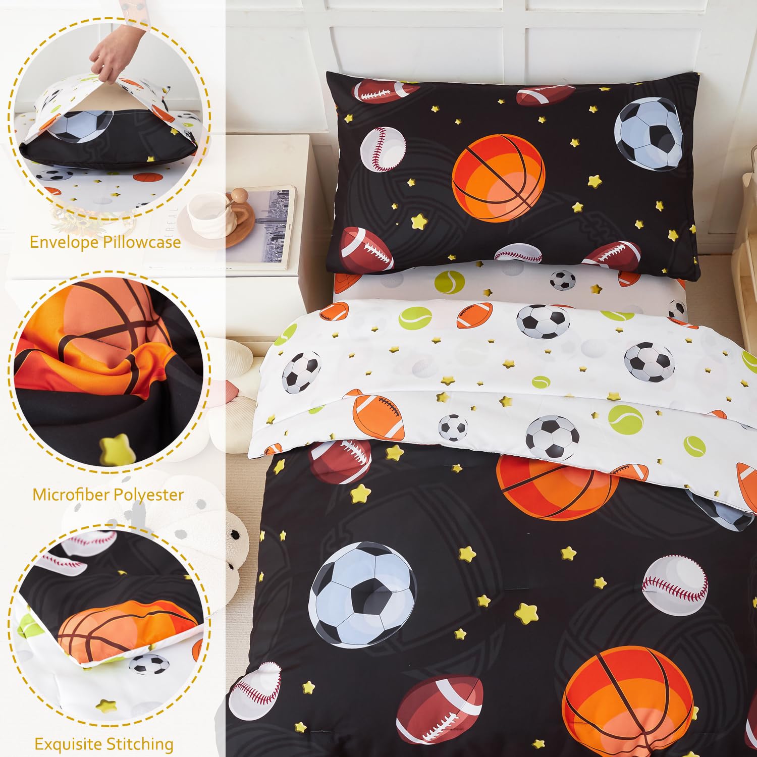 - Q: What is the theme of the toddler bedding set? A: The toddler bedding set has a sports theme, featuring basketball and football designs along with stars.