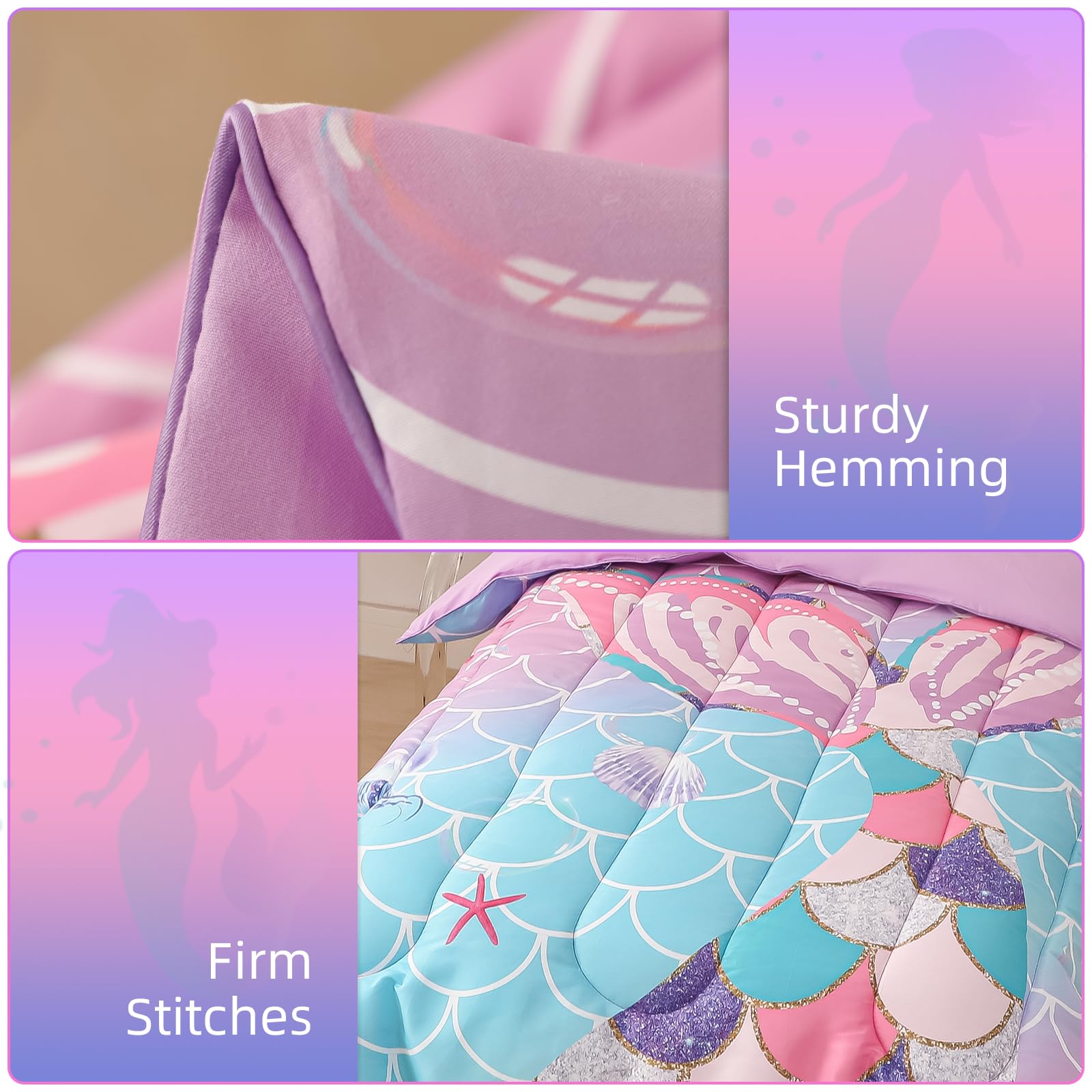- Q: What is the design theme of the bedding set? A: The bedding set features an enchanting mermaid tail theme with captivating purple and blue gradients, designed to inspire imagination in young children.