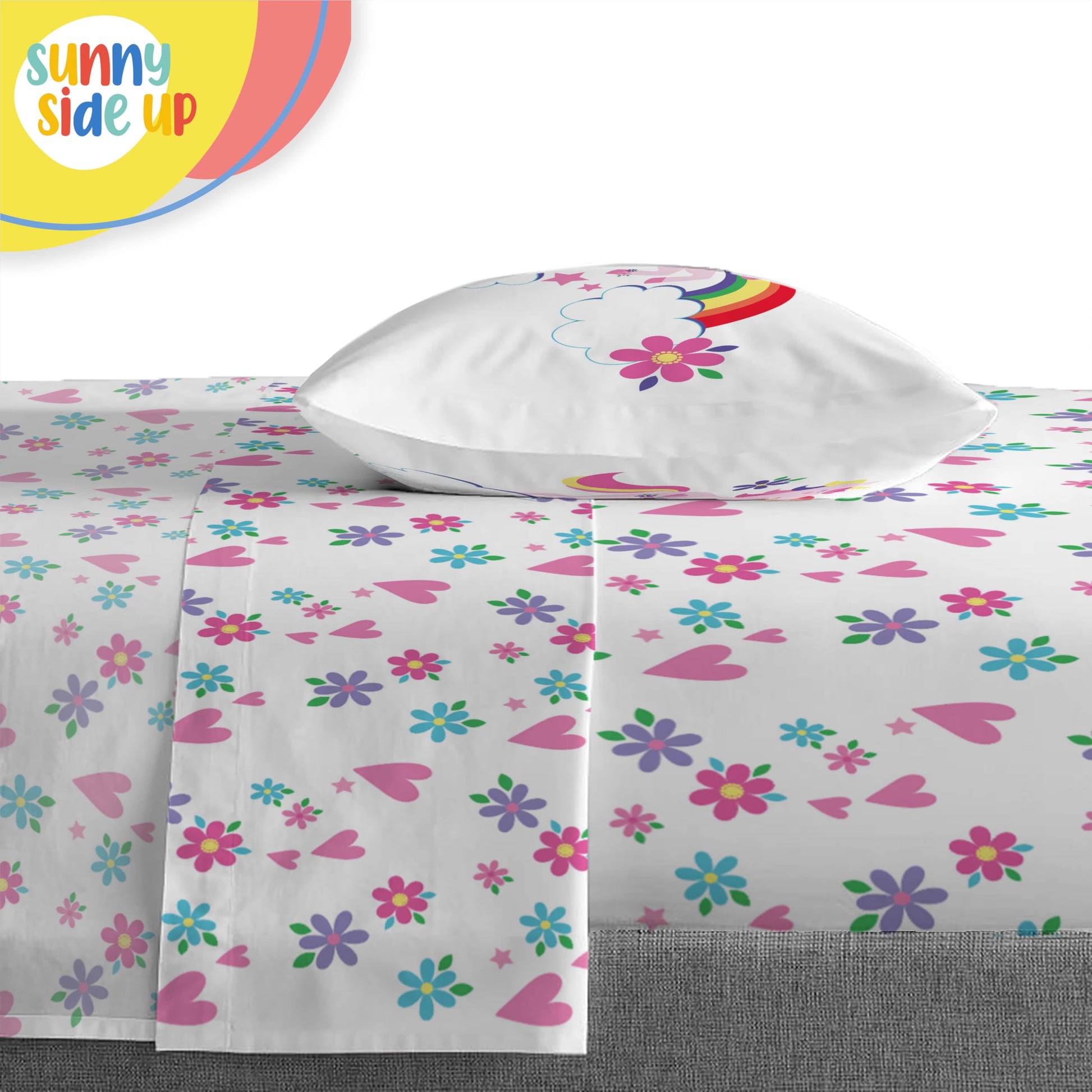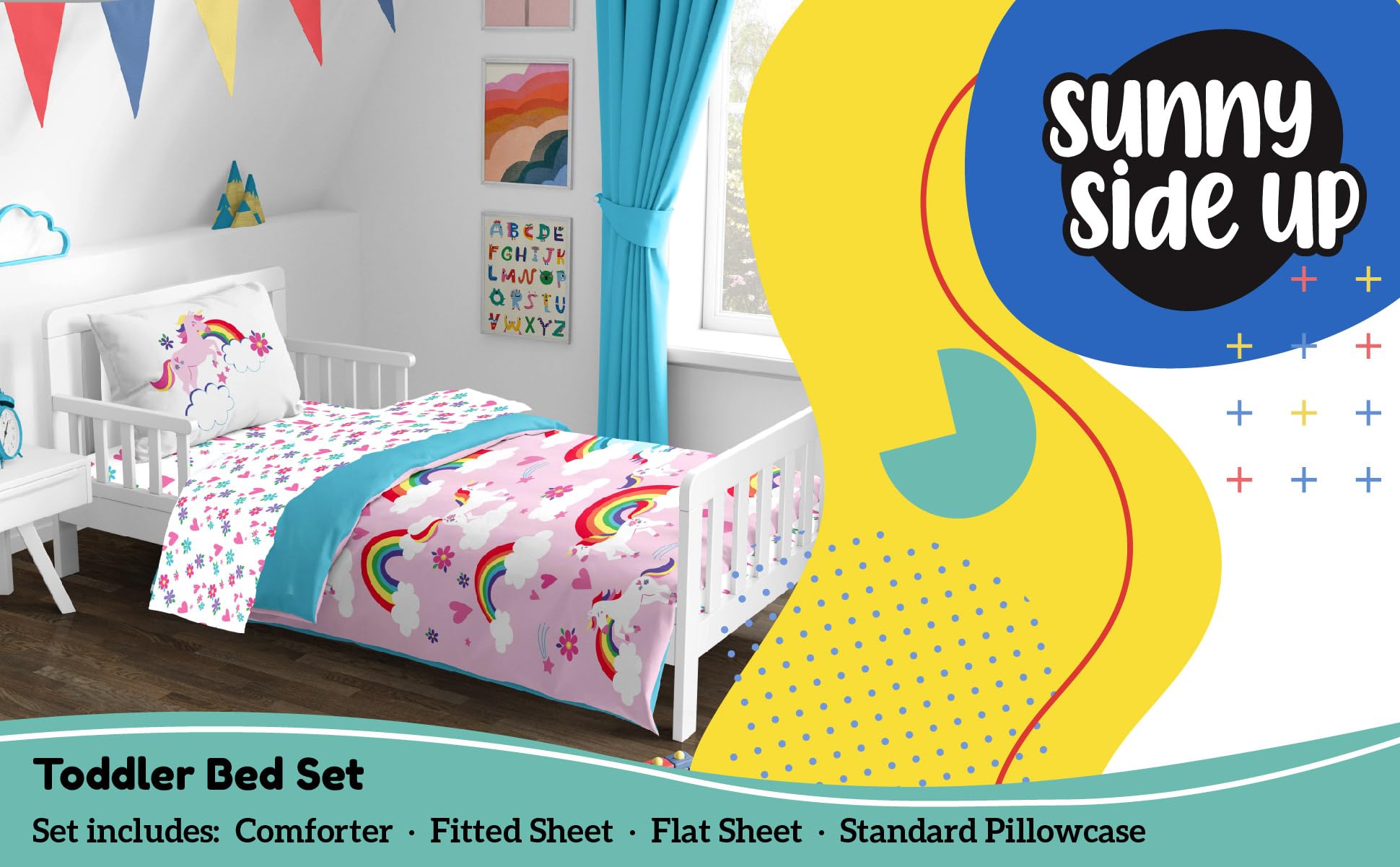 - Q: What items are included in the Sunny Side Up Rainbow Unicorns Toddler Comforter Set? A: The Sunny Side Up Rainbow Unicorns Toddler Comforter Set includes a comforter measuring 42 x 58 inches, a fitted sheet of 28 x 52 inches, a flat sheet measuring 45 x 70 inches, and a standard pillowcase measuring 20 x 30 inches.
