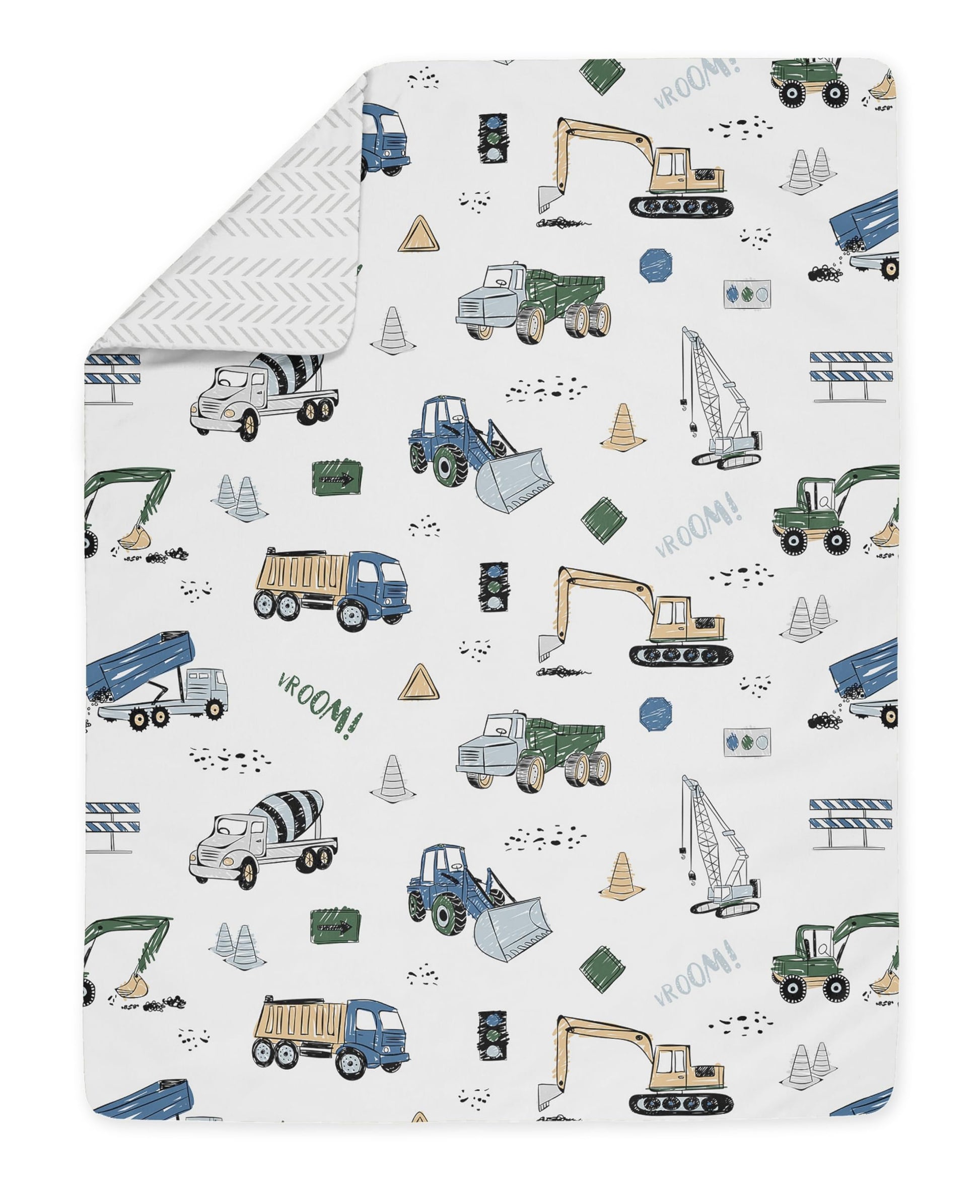 - Q: What is the theme of the bedding set? A: The bedding set features a fun transportation theme with a coloring book-inspired truck print and coordinating tire print.