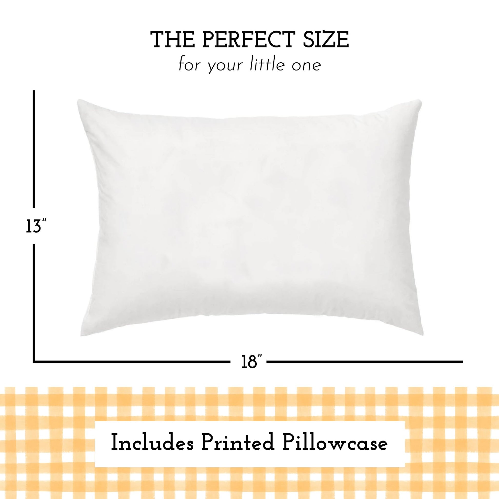 Introducing our versatile Toddler Pillow with Toddler Pillowcase - the perfect companion for your kid's sleep needs! Crafted with soft, hypoallergenic materials, this pillow provides better neck support and sleeping comfort, making it the best pillow for kids of all ages. Whether it's bedtime at home, naptime, or a quick snooze at school, our pillow guarantees better naps in any setting. Plus, it's travel-friendly, ensuring comfier journeys on the go. The included 13x18 cotton toddler pillowcase is designed in the USA by our team and is available in many run and vibrant prints. This envelope pillowcase style adds a touch of whimsy to bedtime while keeping your kid's pillow clean and fresh. Made with attention to detail and safety in mind, our pillow and pillowcase set is hypoallergenic, perfect for even the most sensitive sleepers. Say goodbye to restless nights and hello to rejuvenating sleep with our kids' pillow and toddler pillowcase combo. Whether you're looking for small pillows for sleeping or a travel nursing pillow, our product delivers on all fronts. Transform your kid's sleep routine with our hypoallergenic pillow and pillowcase set today!