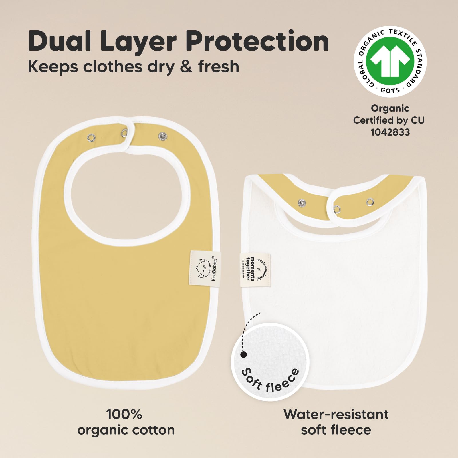 - Q: What materials are the baby bibs made from? A: The baby bibs are made from 100% GOTS-certified organic cotton and are backed with water-resistant fleece for added absorption.