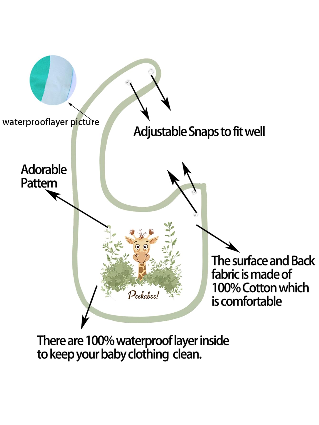 - Q: What material are the bibs made from? A: The bibs are made from soft, durable cotton with a waterproof layer in between the cotton front and back panel.
