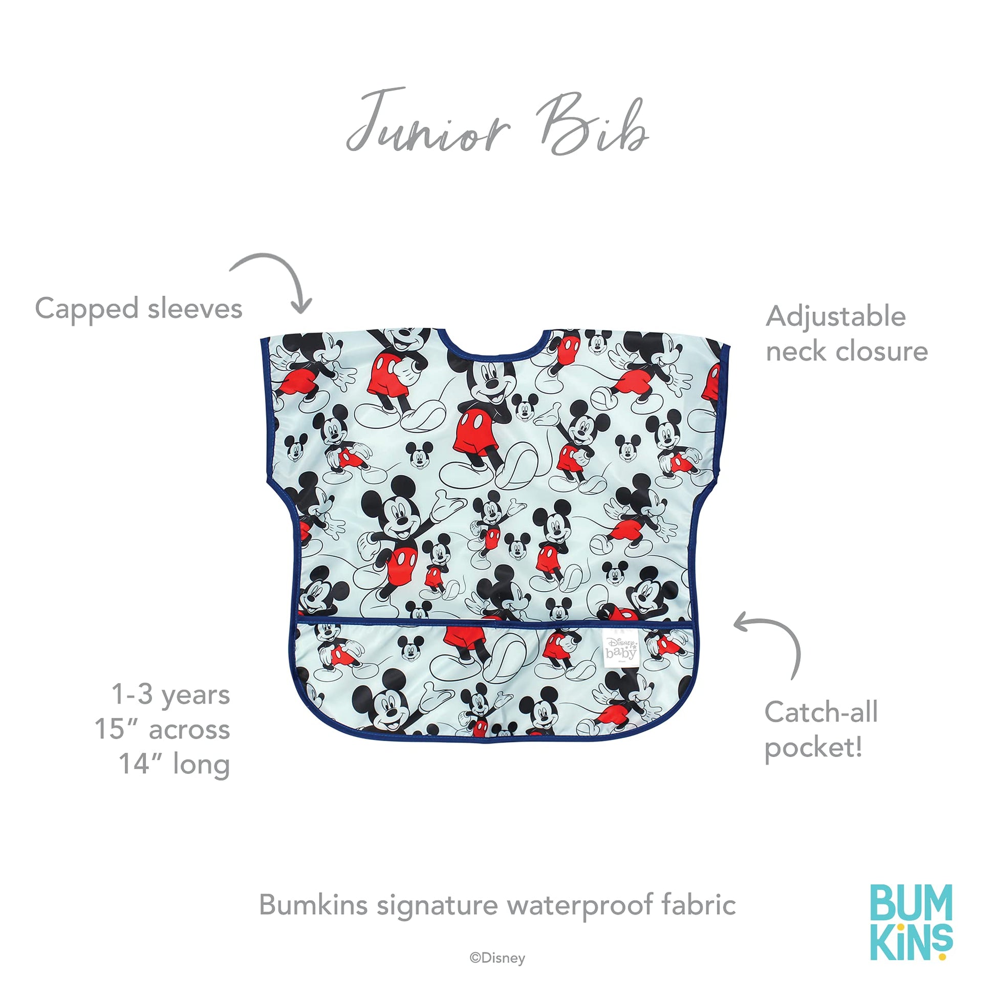 - Q: Does the bib feature any designs or characters? A: Yes, this bib features an adorable Disney Mickey Mouse classic design.