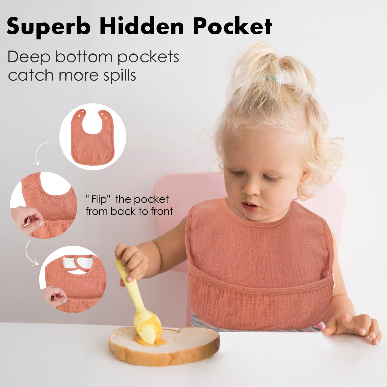 - Q: How do the hidden pockets work? A: The hidden pocket design allows for an additional pouch that catches more drool and food residues, keeping your baby's clothes dry and clean during feeding and playtime.