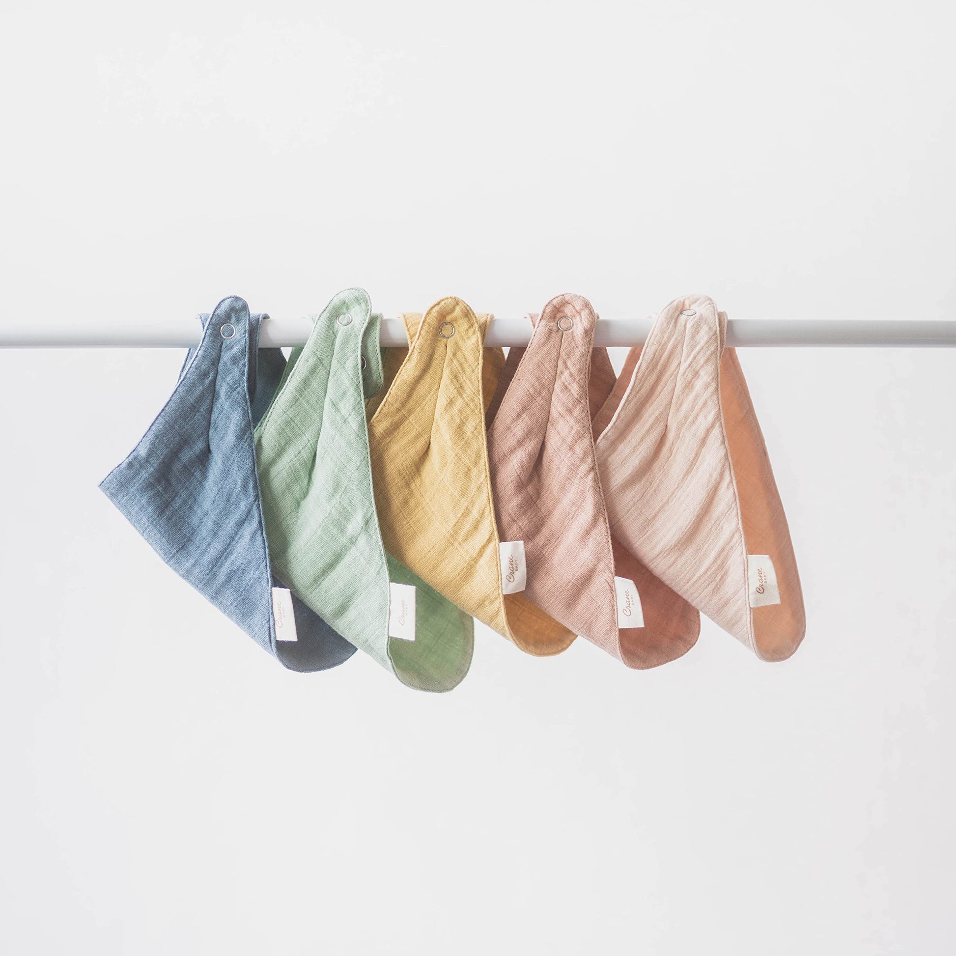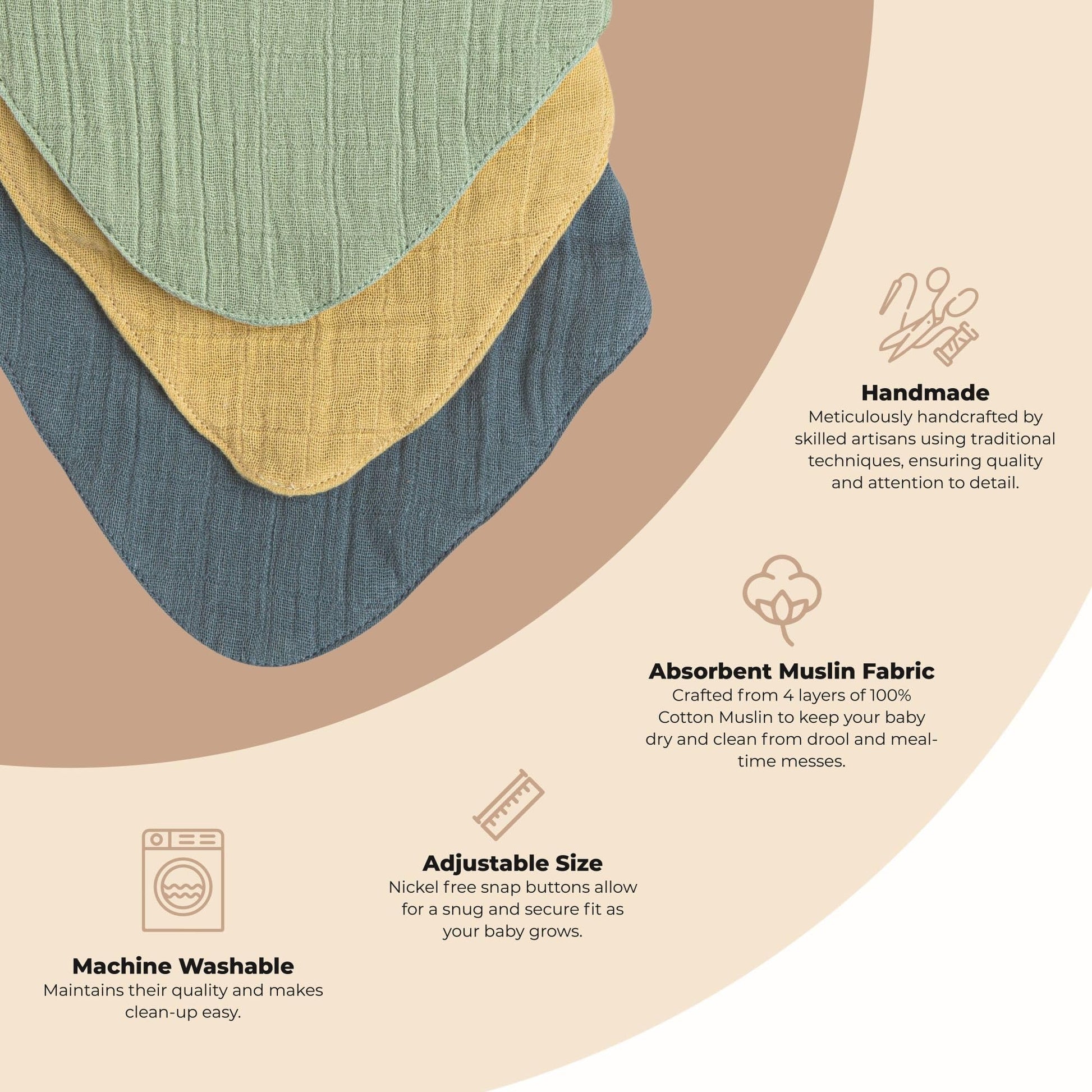 - Q: What materials are the bibs made of? A: The bibs are made from soft, lightweight 4-layer muslin cotton, which is gentle on a baby's skin.
