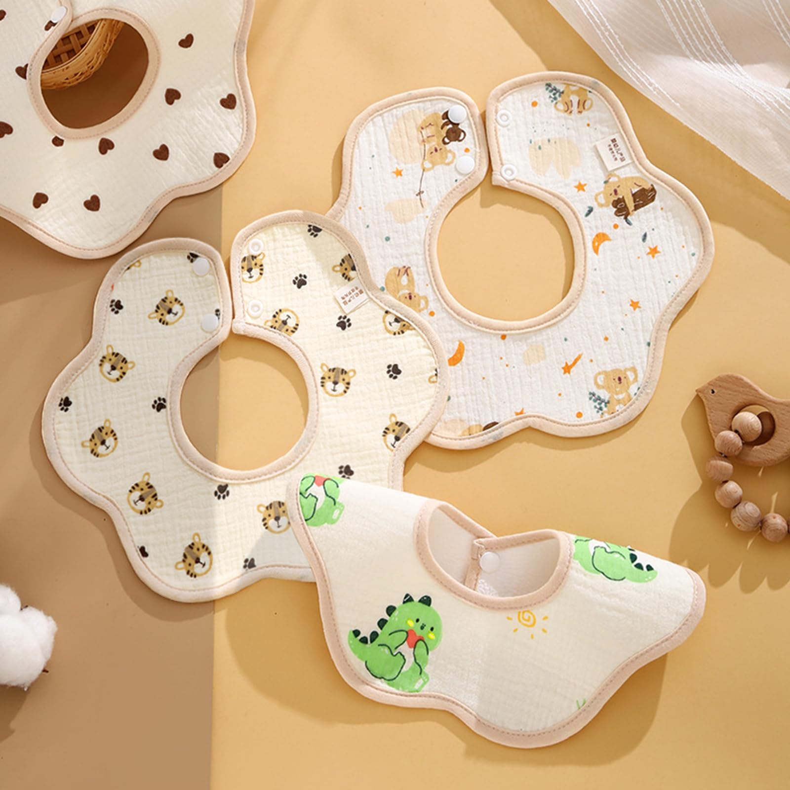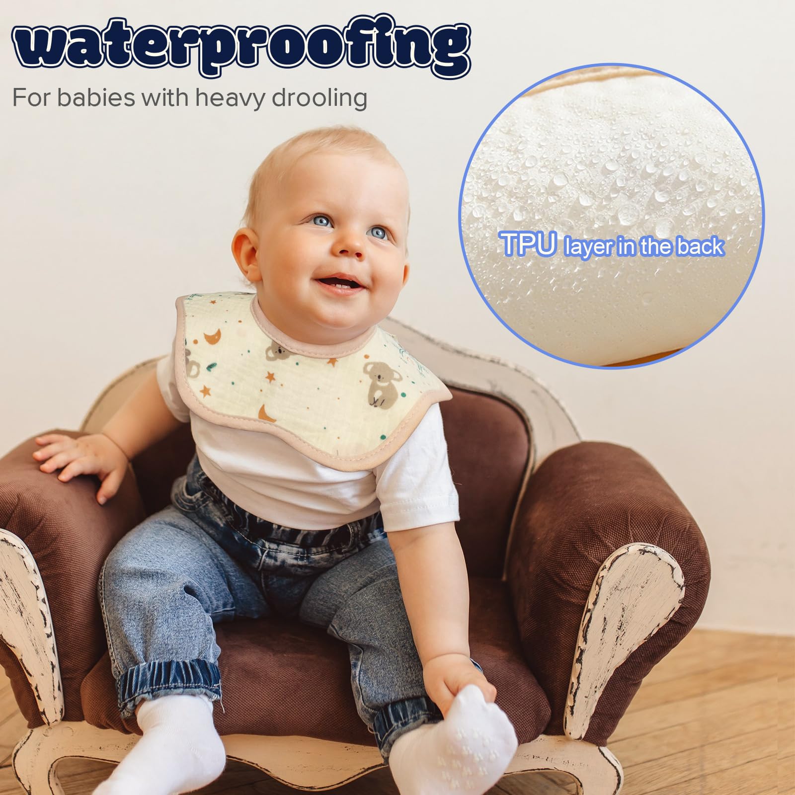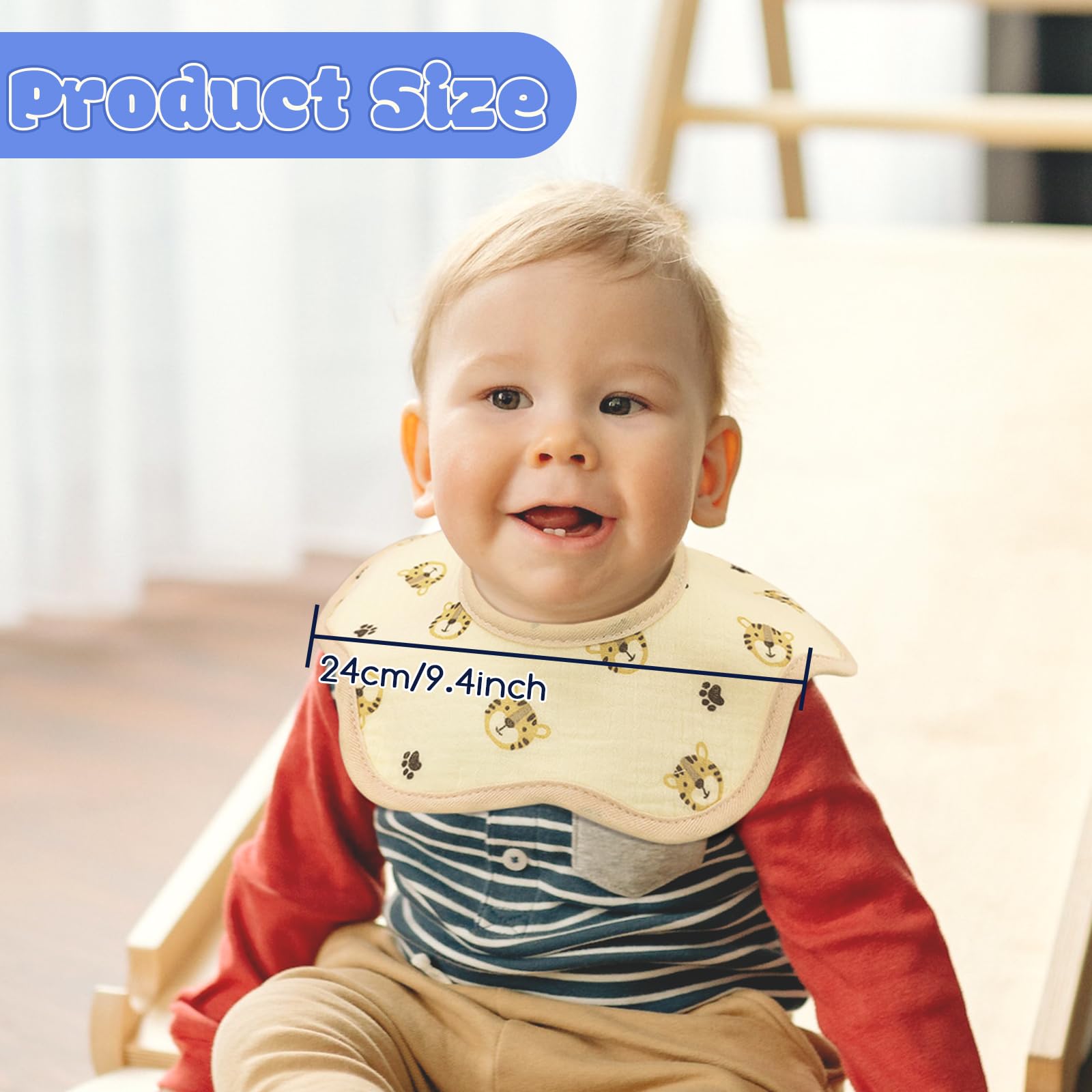 - Q: What materials are used in these bibs? A: The bibs are made of high-quality 100% Muslin cotton for softness and absorbency, along with a waterproof inner layer to provide leak-proof protection.