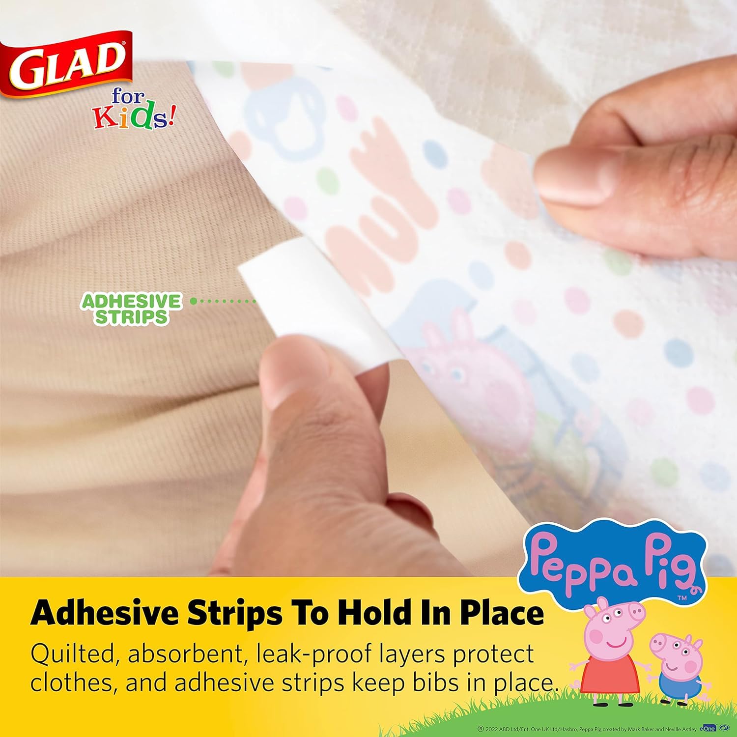 - Q: What age range are these bibs suitable for? A: The Glad for Kids Peppa Pig paper bibs are designed for young children, typically suitable for toddlers and preschoolers who are learning to eat.