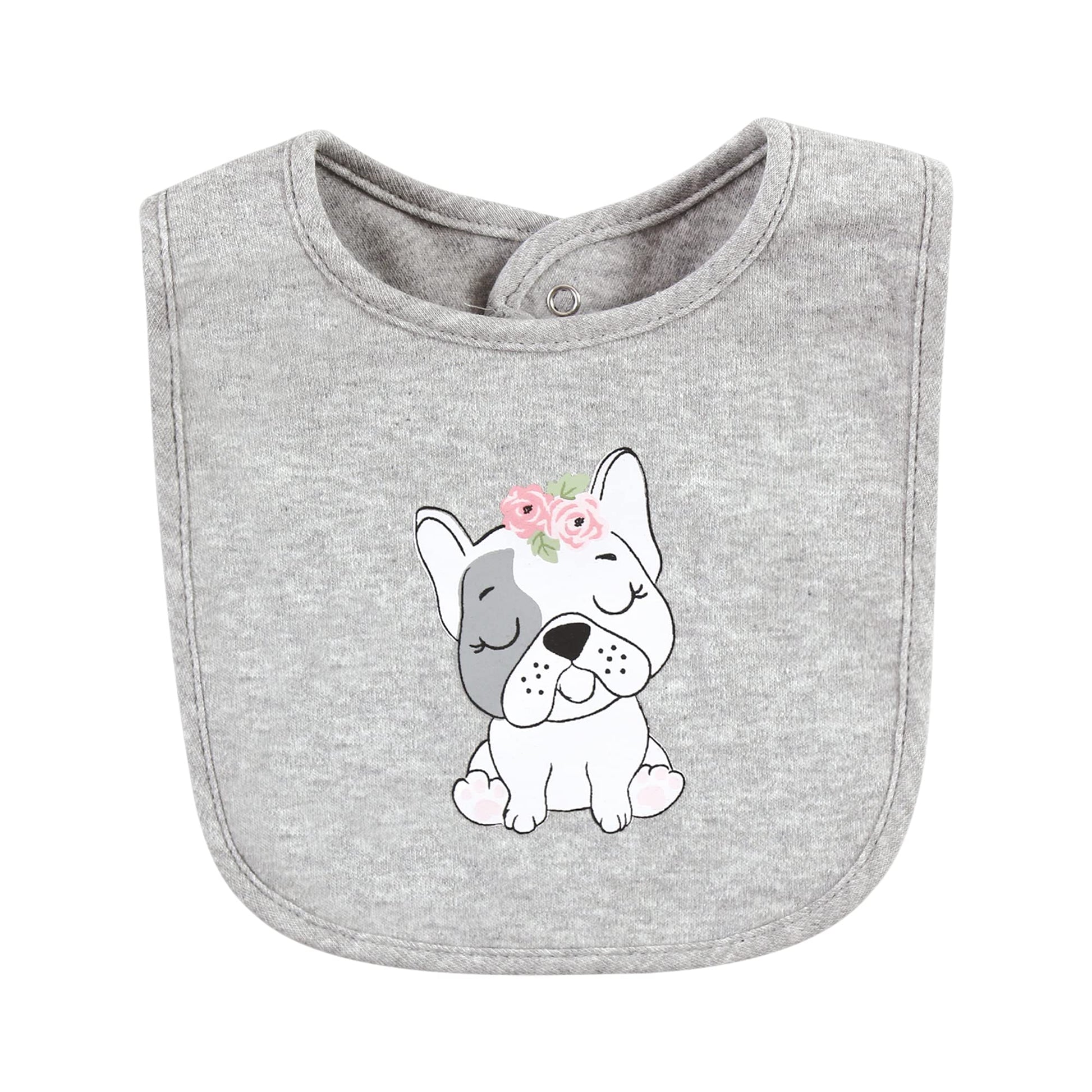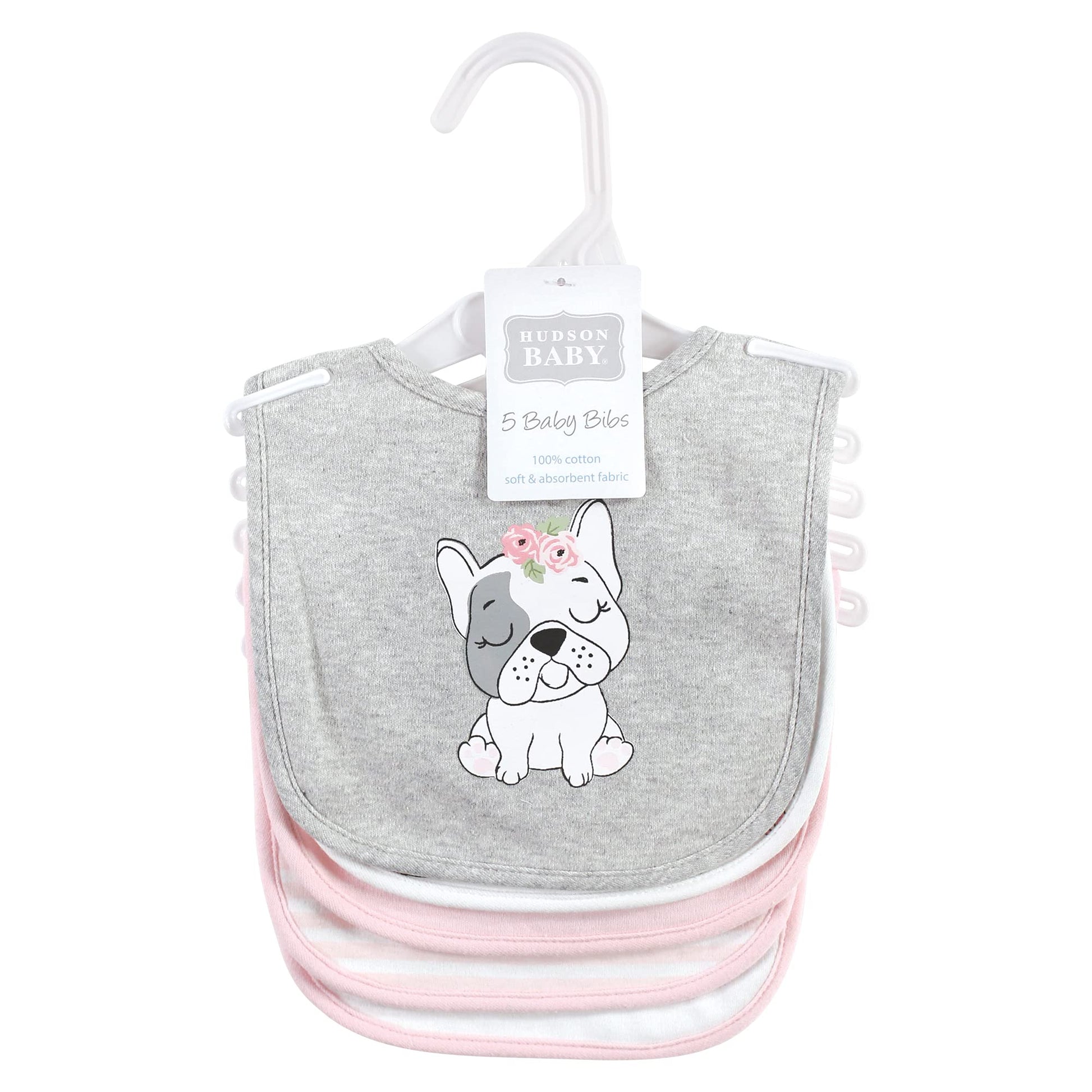 - Q: What design does the Hudson Baby bib feature? A: The Hudson Baby bib features a whimsical dog design, making it fun and appealing for both baby girls and boys.